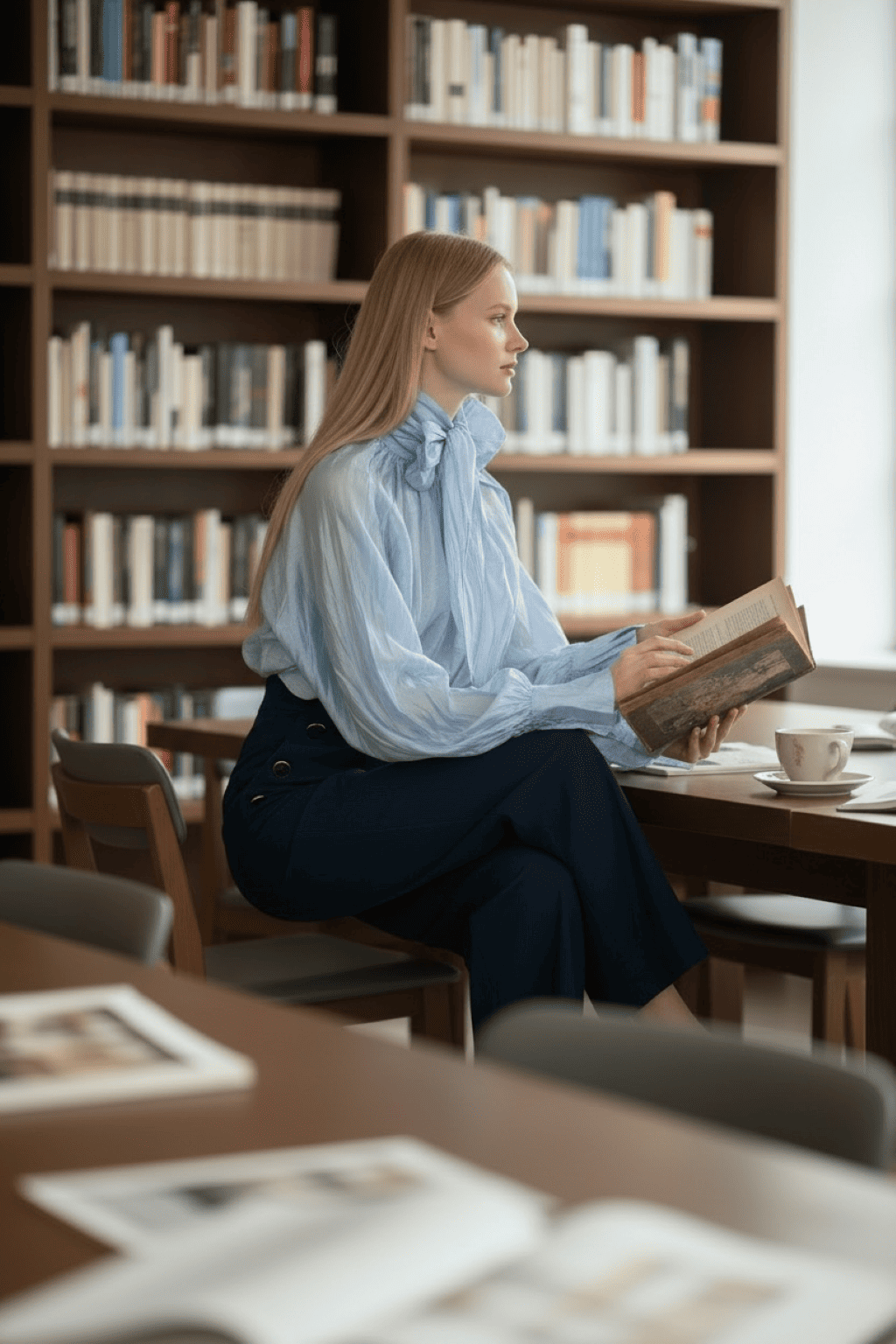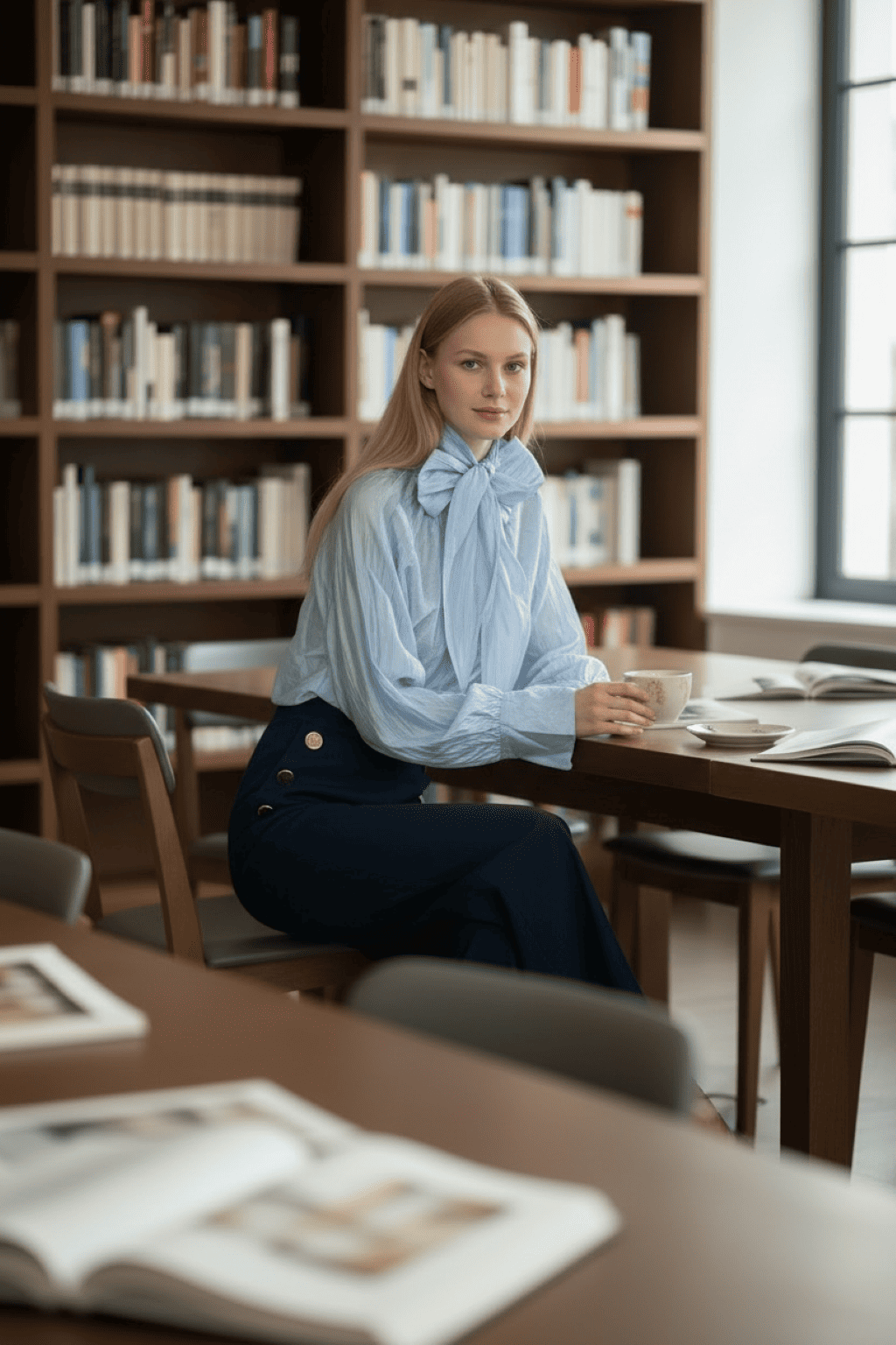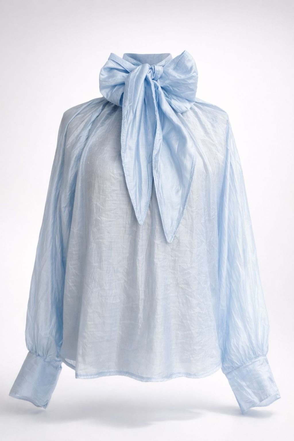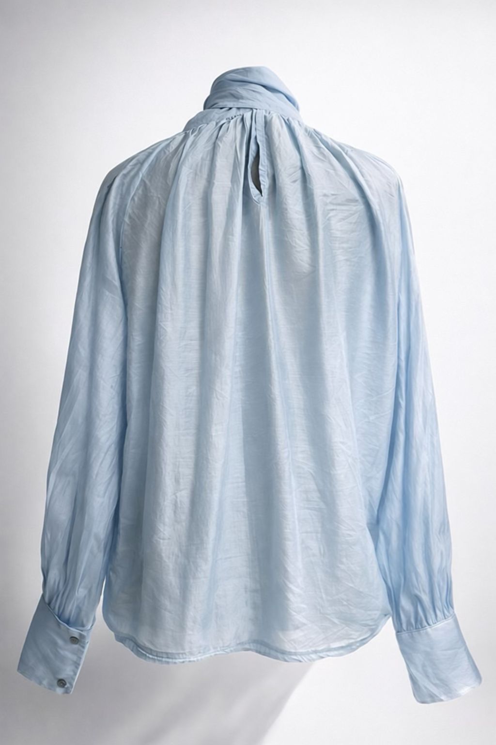 Blusa de color azul claro. Cuello alto con lazada, que puedes ajustar a la medida que desees. Mangas ranglán ligeramente abullonadas, que ofrece mayor libertad de movimiento y un ajuste al hombro más cómodo y fluido. Puños con dos botones. Destacar su caída aportando mucho estilo. Muy versátil, para cualquier look casual o invitada.