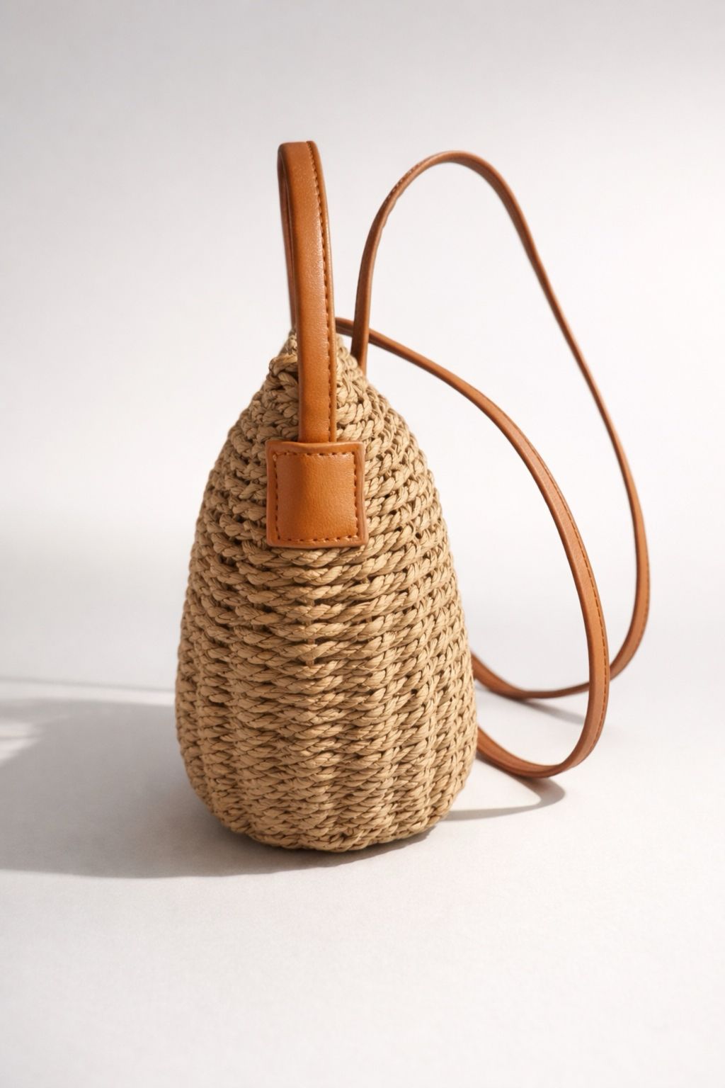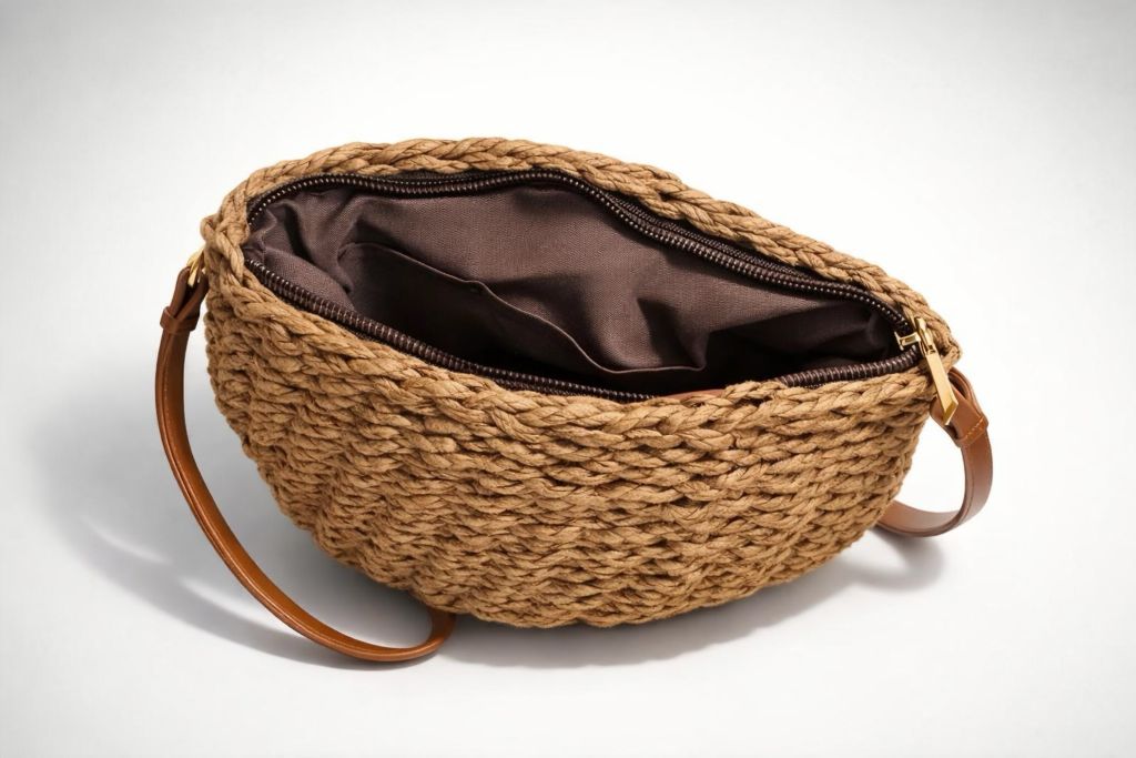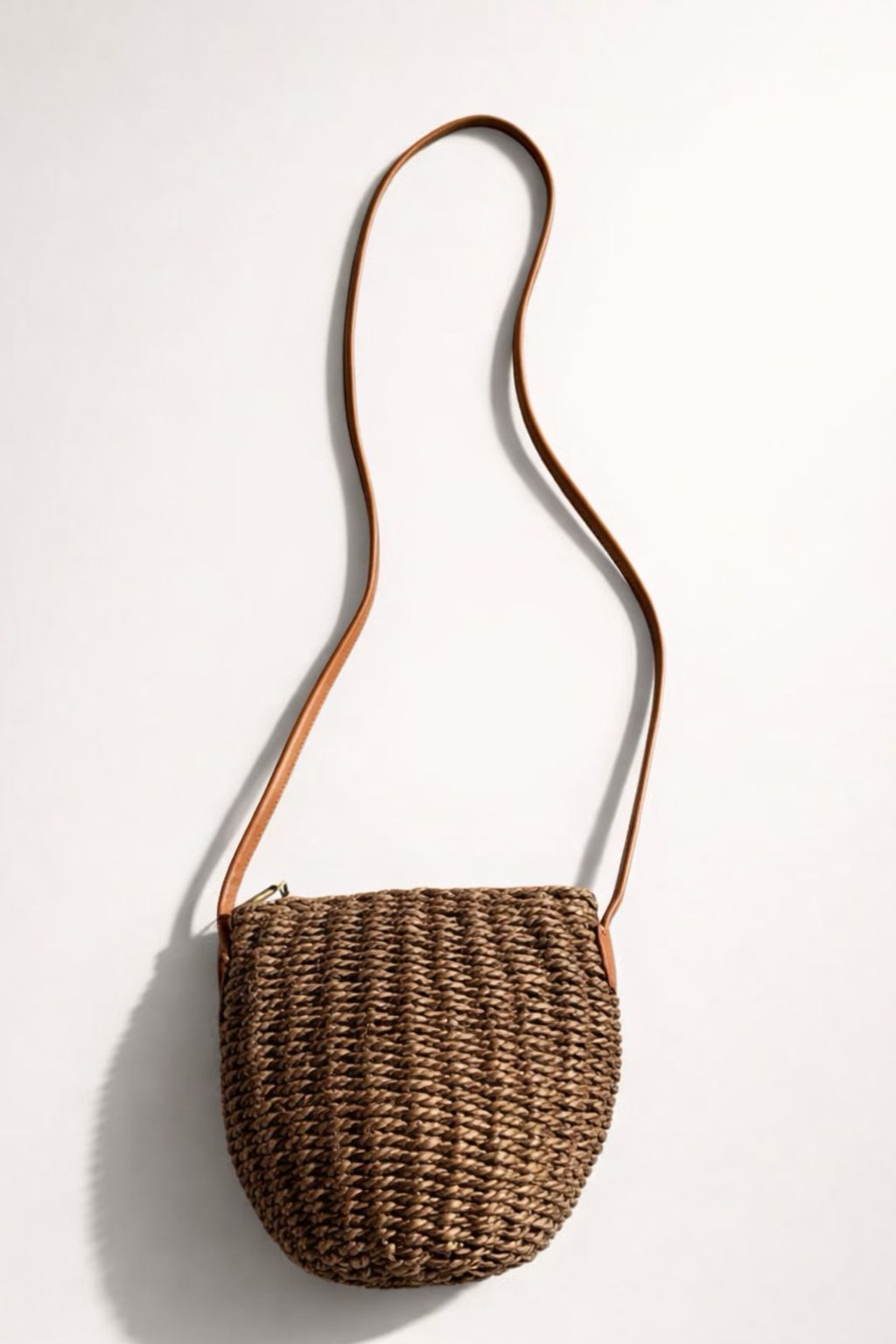 Bolso bombonera en color marrón. Forro interior con un bolsillo, se cierra con cremallera en la parte superior. Base redonda. Incorpora correa para usarla a modo de bandolera.