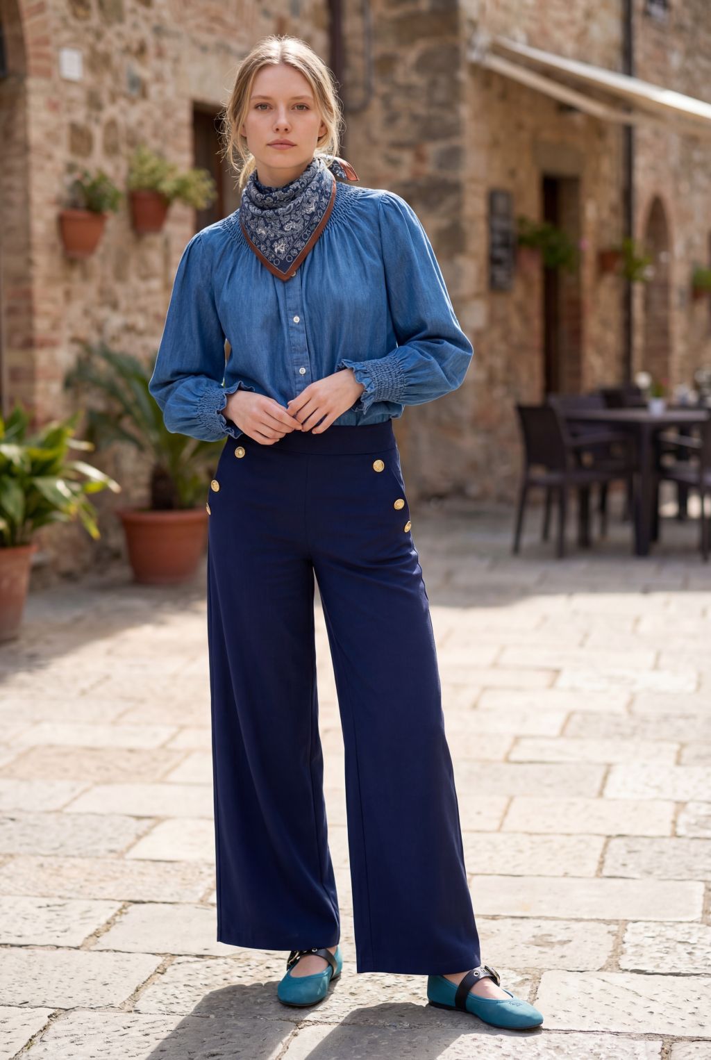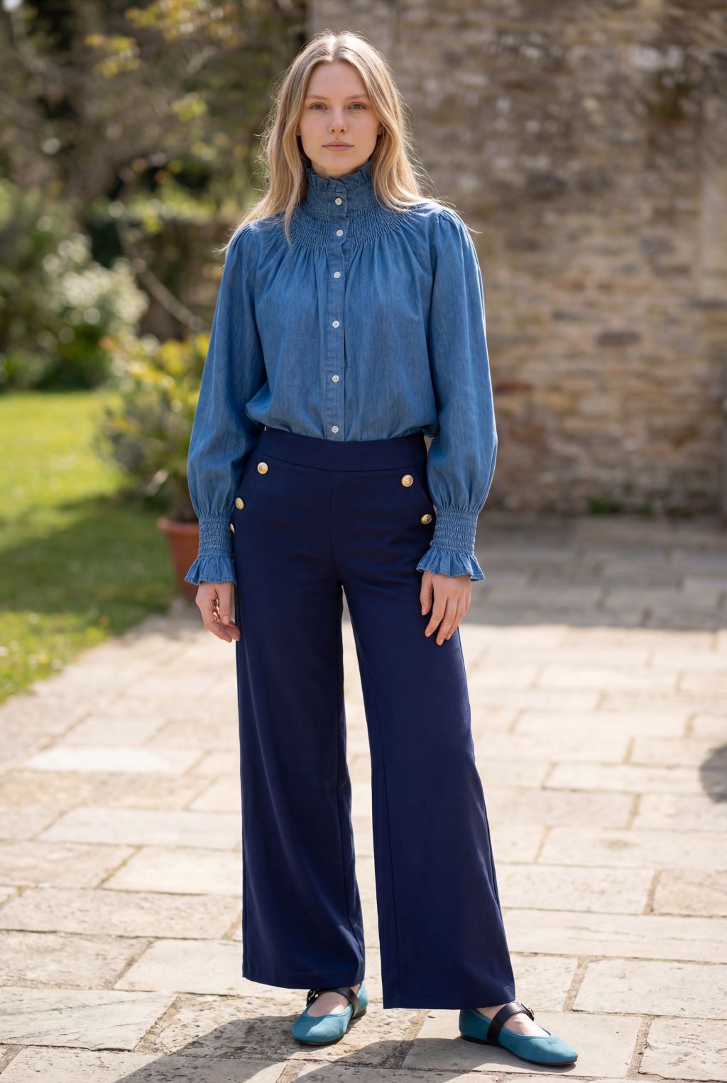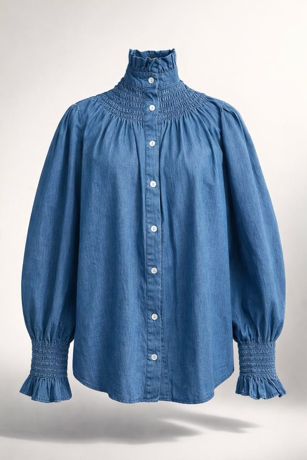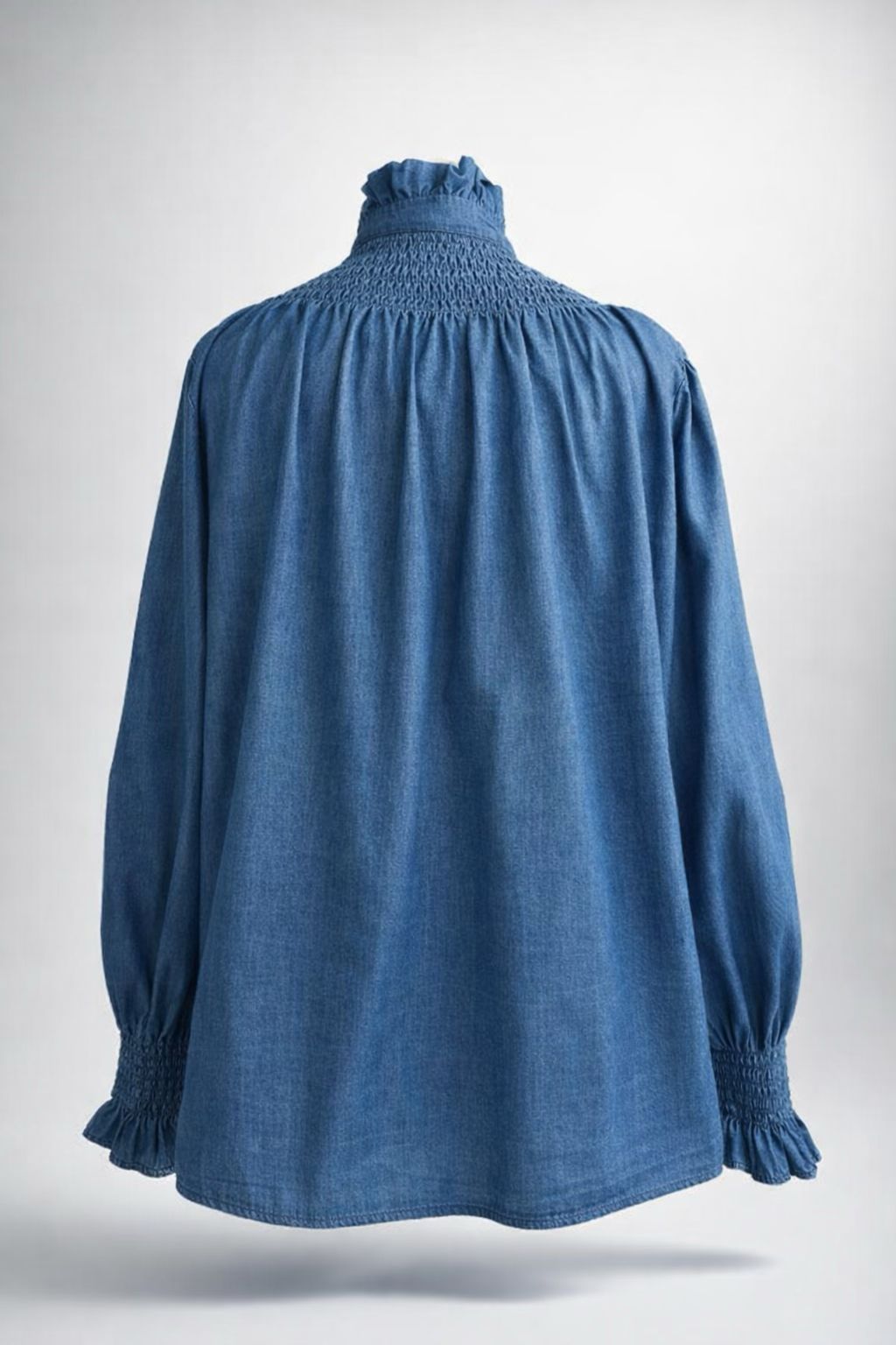 Camisa denim de manga larga. Cerrada con botones en la parte delantera, cuello alto con volantes, detalles en nido de abeja, mangas ligeramente abullonadas fruncidas con volantes. Destaca la caída del tejido.