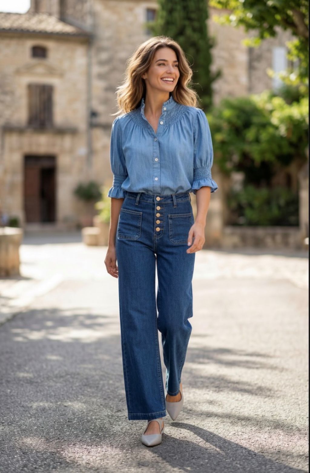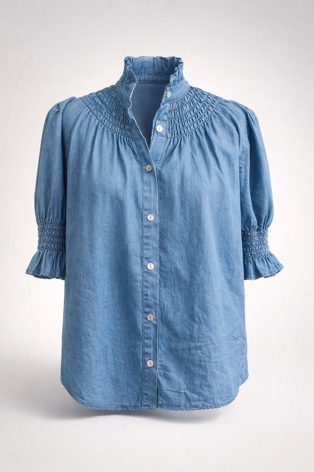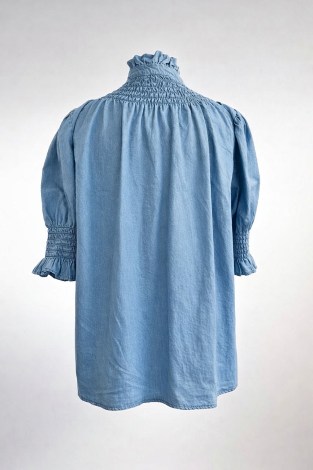 Camisa de manga corta en tejido denim. Cerrada con botones en la parte delantera, cuello alto con volantes, detalles en nido de abeja. Mangas ligeramente abullonadas fruncidas con pequeños volantes. Ideal para un look casual.