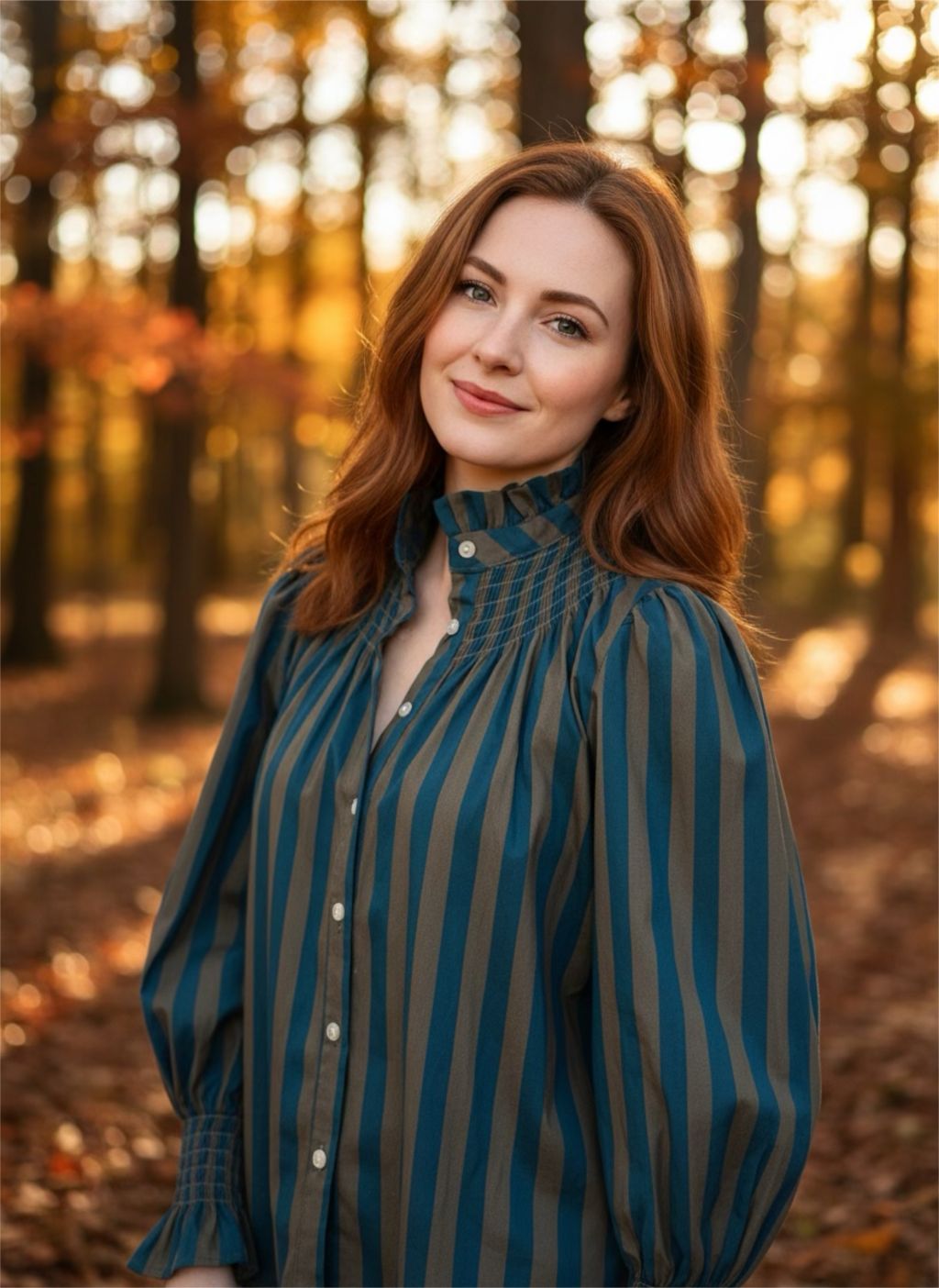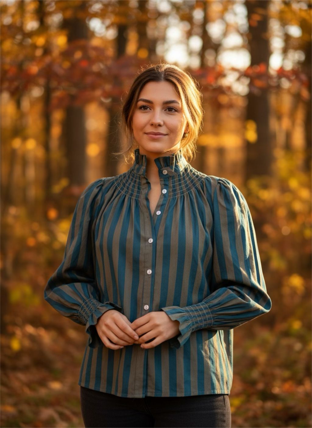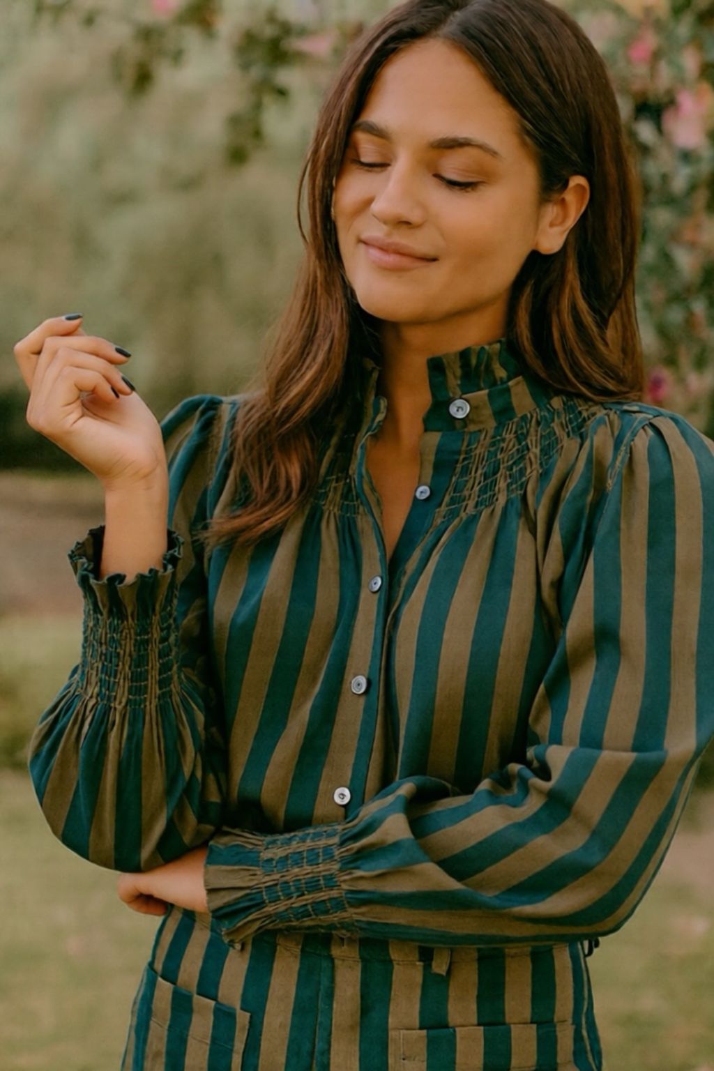 Camisa de manga larga estampada en rayas. Cerrada con botones en la parte delantera, cuello alto con volantes, detalles en nido de abeja, mangas ligeramente abullonadas fruncidas con volantes.