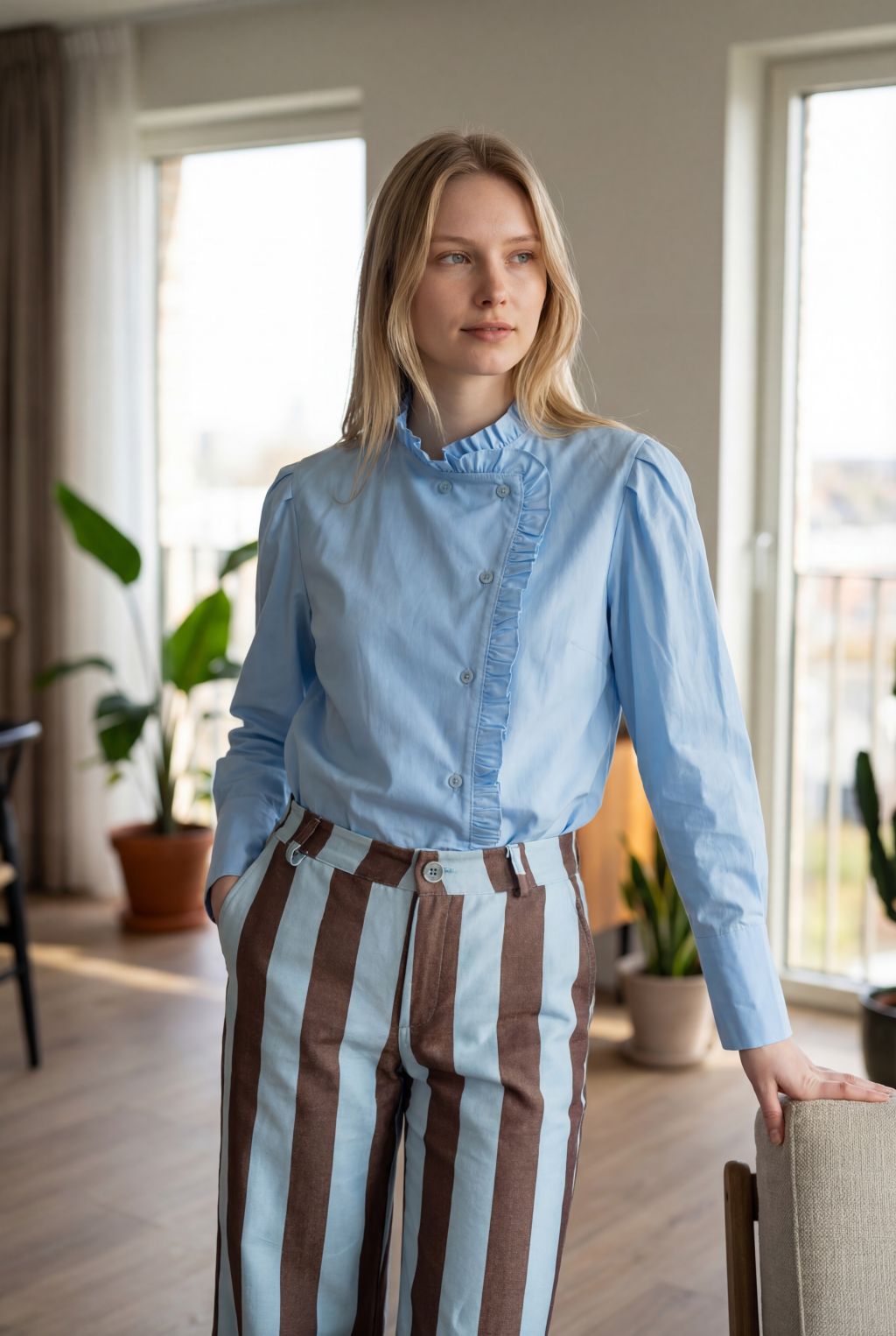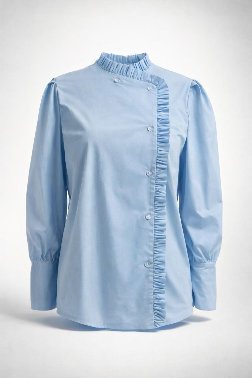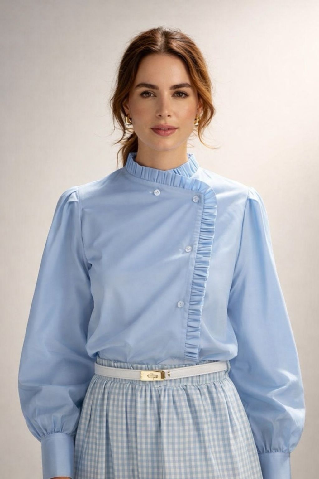 Camisa de manga larga de popelín en color azul claro. Cierre delantero ligeramente diagonal con pequeños volantes alrededor de toda la botonadura. Puño ancho con dos botones. Mangas ligeramente abullonadas. Corte recto. Los puños llegan a la muñeca.