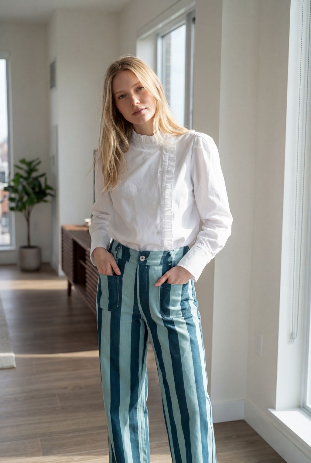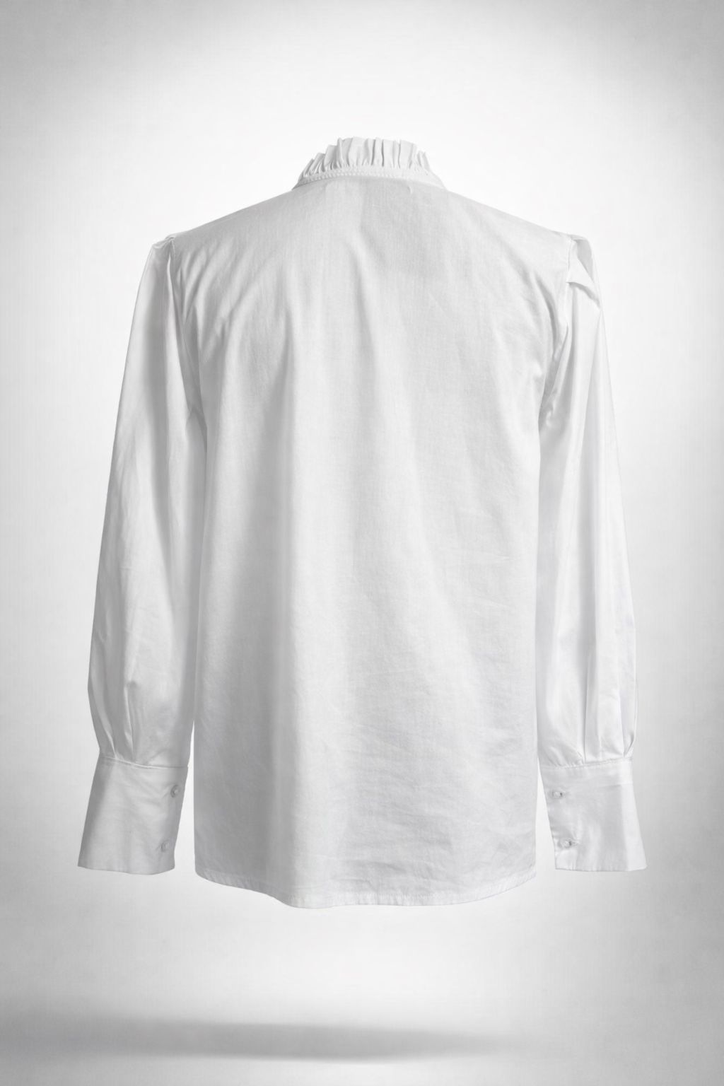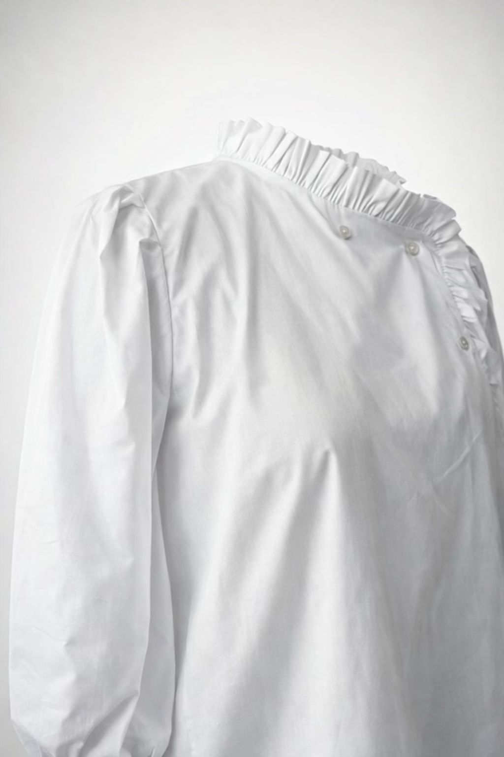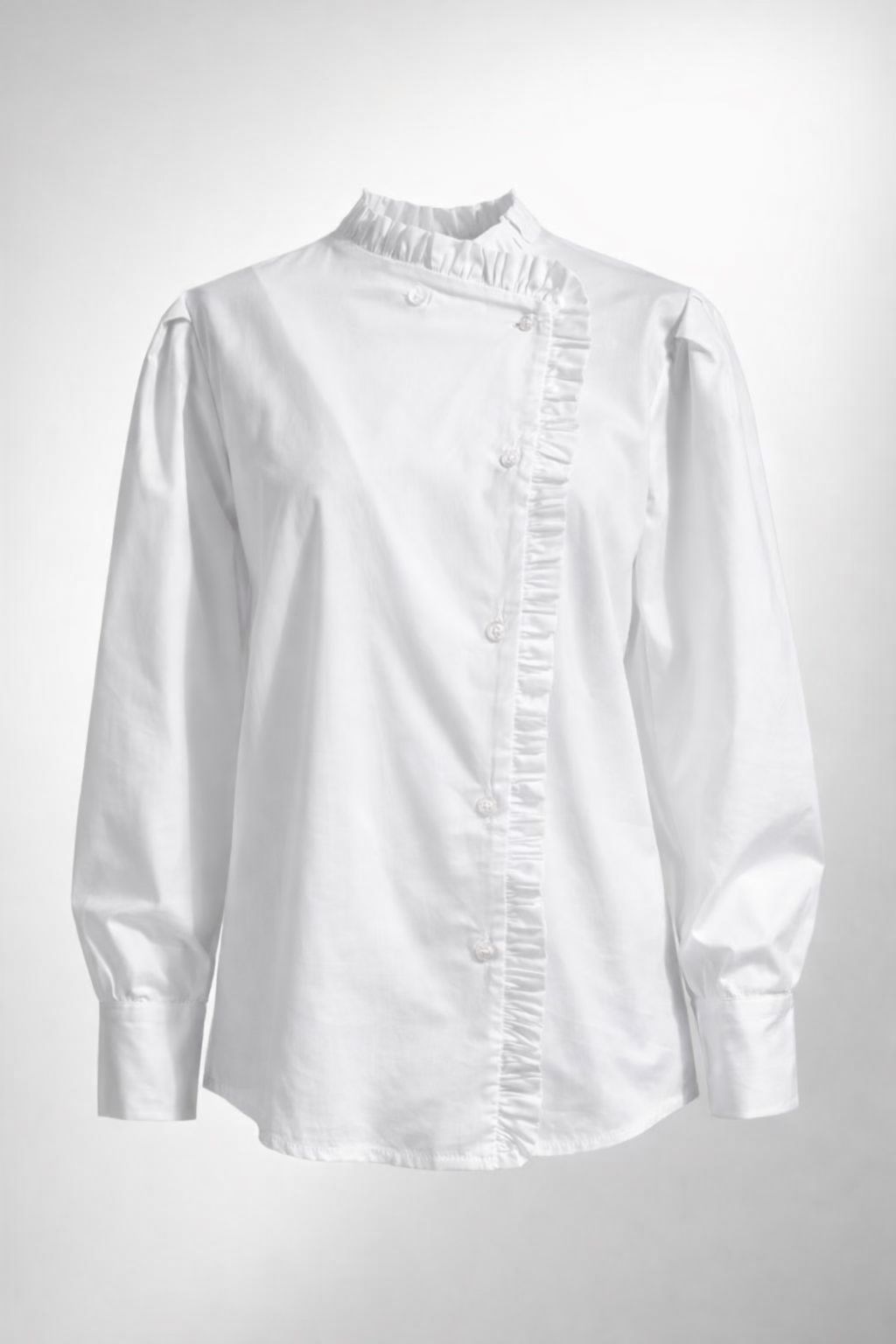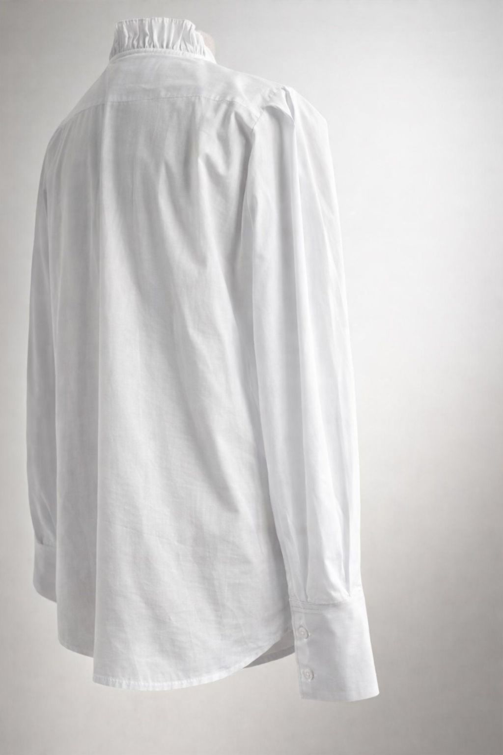 Camisa de manga larga de popelín en color blanco. Cierre delantero ligeramente diagonal con pequeños volantes alrededor de toda la botonadura. Puño ancho con dos botones. Mangas ligeramente abullonadas. Corte recto. Los puños llegan a la muñeca.