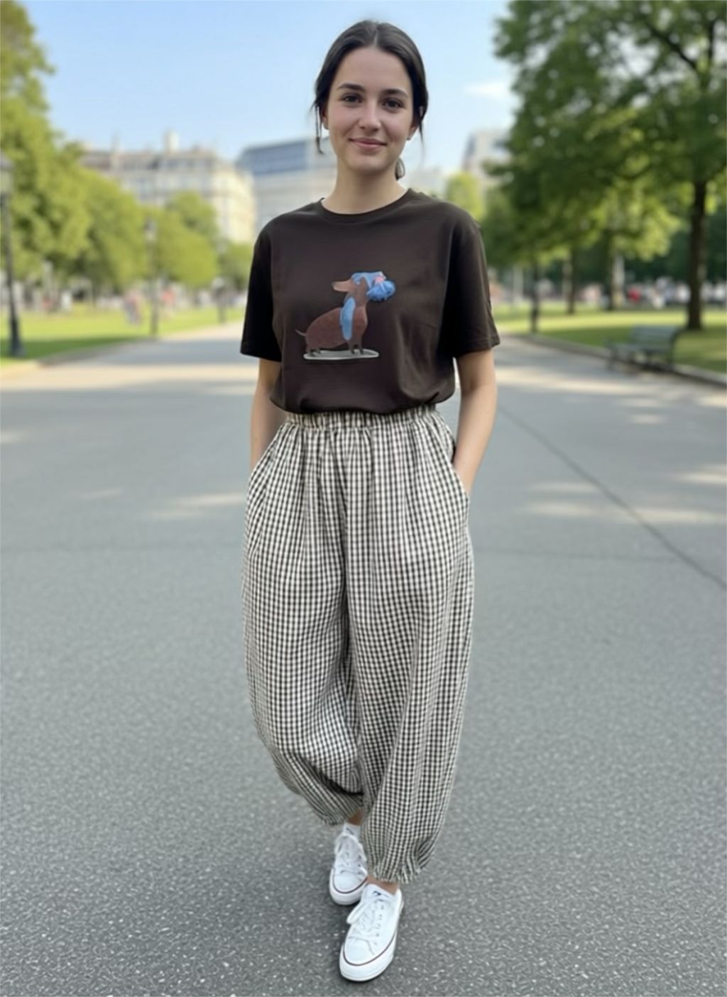 Camiseta manga corta en color chocolate. Detalle de la borla en el estampado del Teckel. Tejido extra suave. Ideal para cualquier look.
