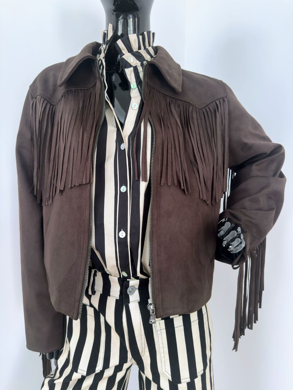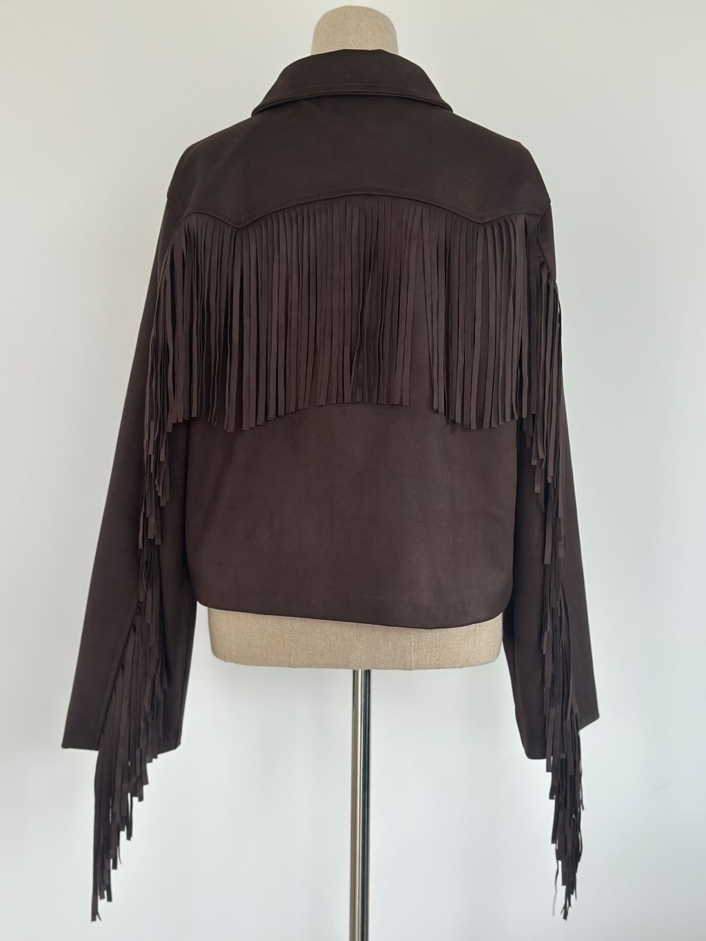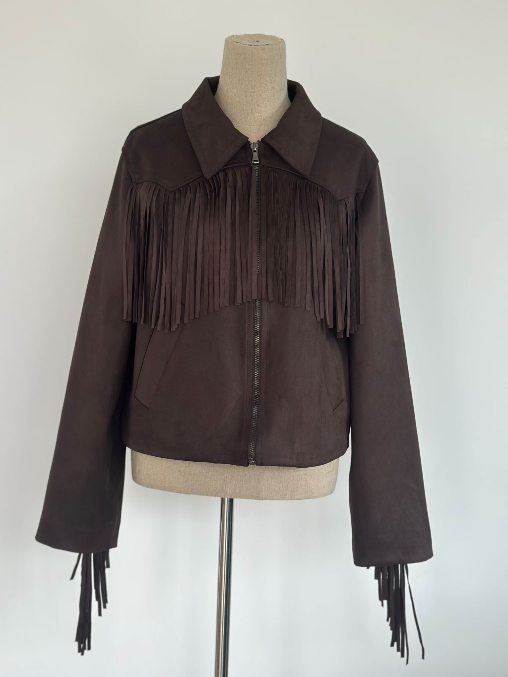 Chaqueta efecto ante con flecos, de cuello solapa. Bolsillos delanteros de vivo. Cierre frontal con cremallera. Forro interior.