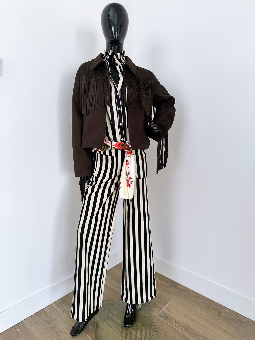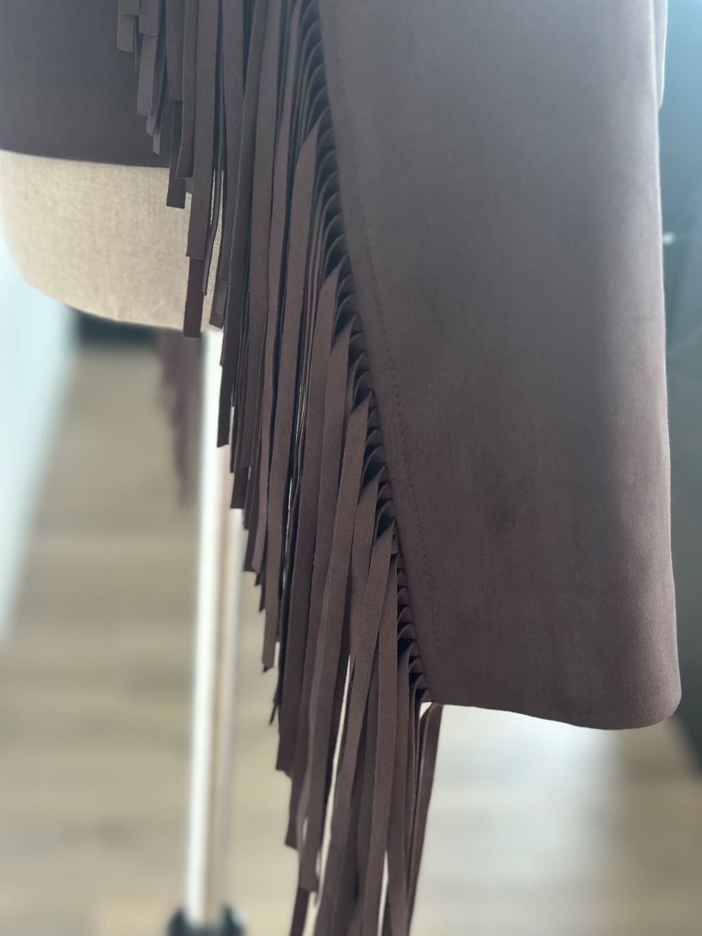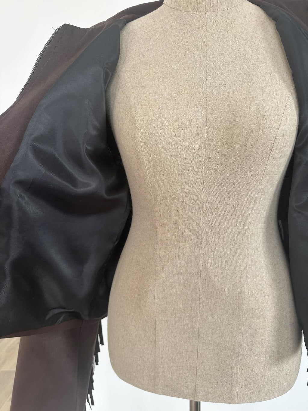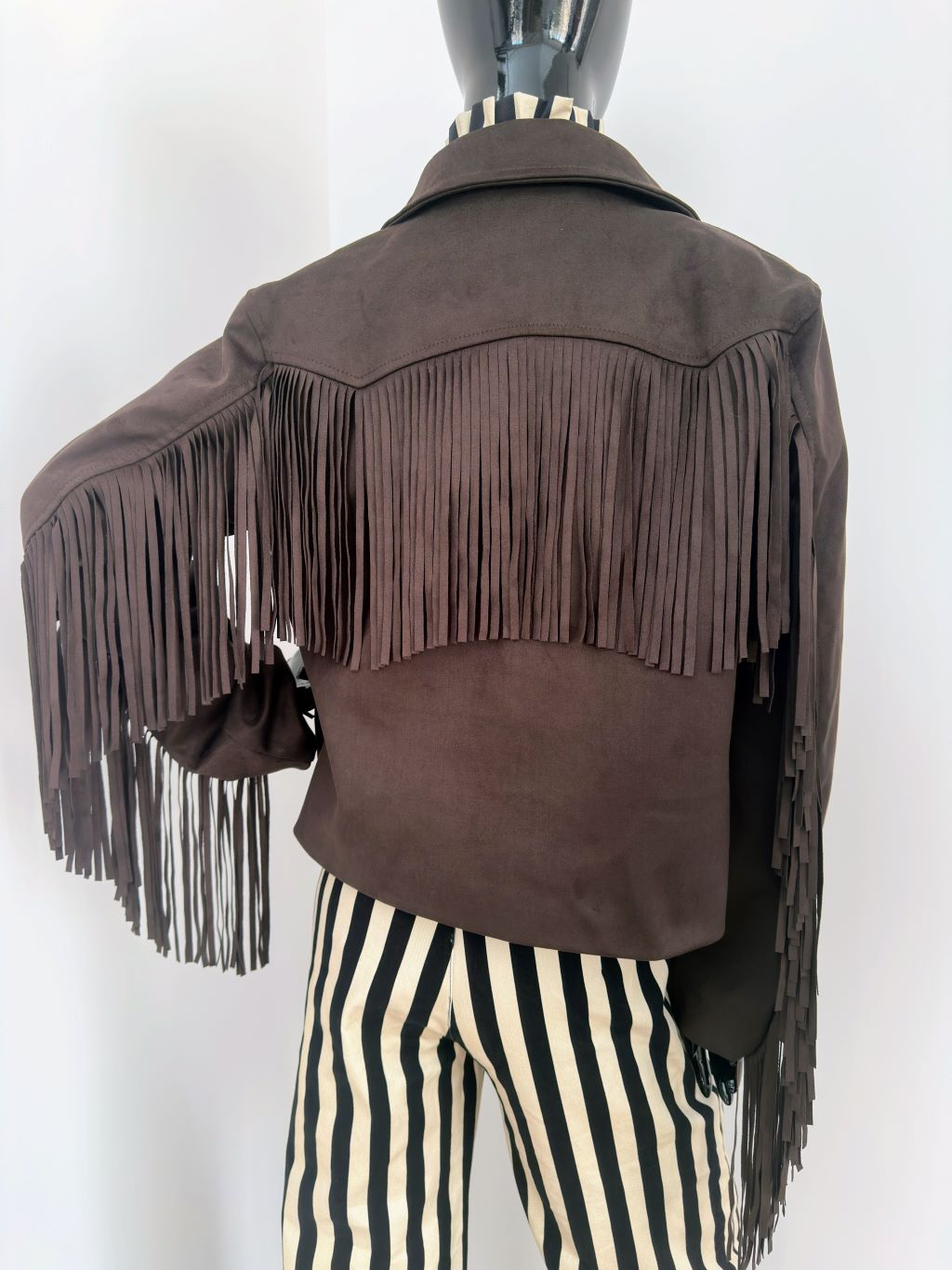 Chaqueta efecto ante con flecos, de cuello solapa. Bolsillos delanteros de vivo. Cierre frontal con cremallera. Forro interior.