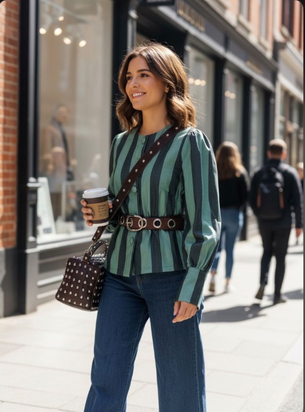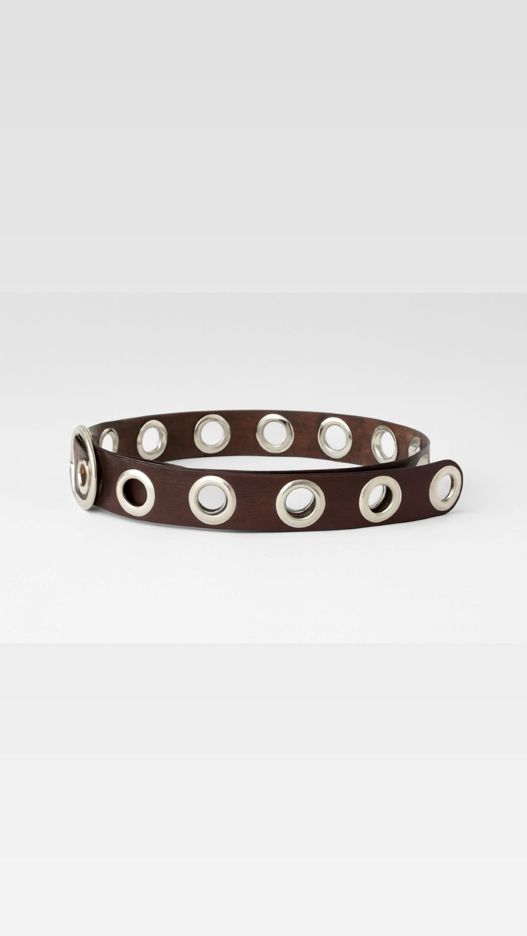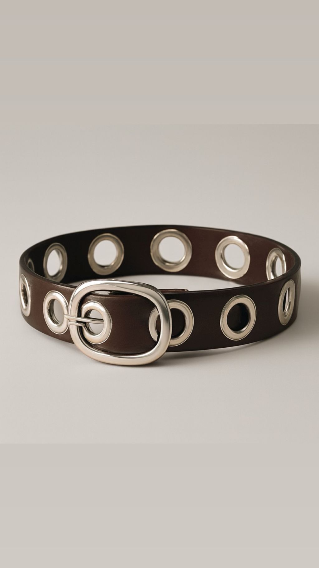 Cinturón de cuero 100% en color cuero, se caracteriza por llevar círculos a lo largo del cinturón, facilitando ajustarlo donde desees. La hebilla es plateada.