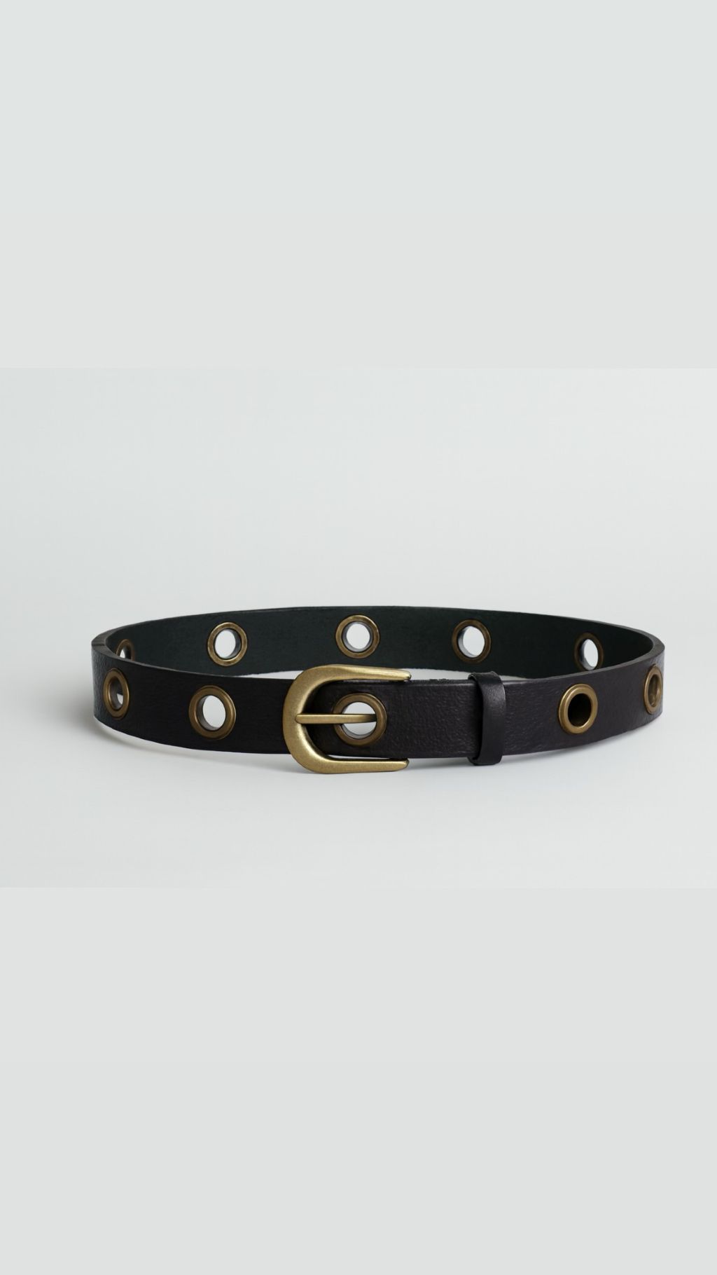 Cinturón de cuero 100% en color negro, se caracteriza por llevar círculos a lo largo del cinturón, facilitando ajustarlo donde desees. La hebilla es dorado envejecido.