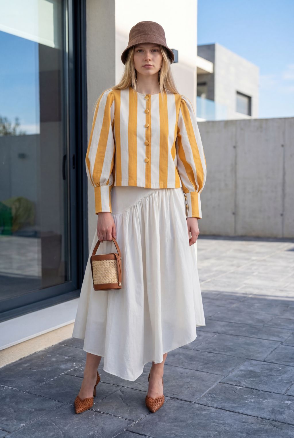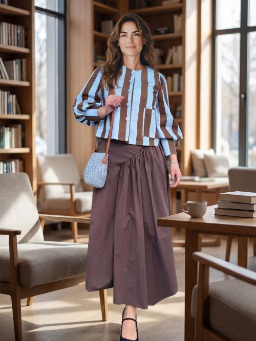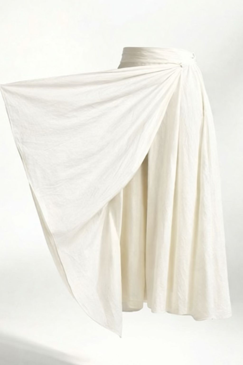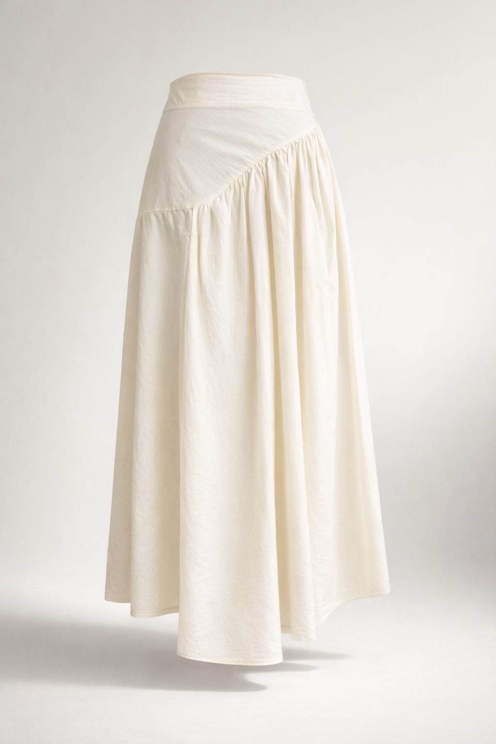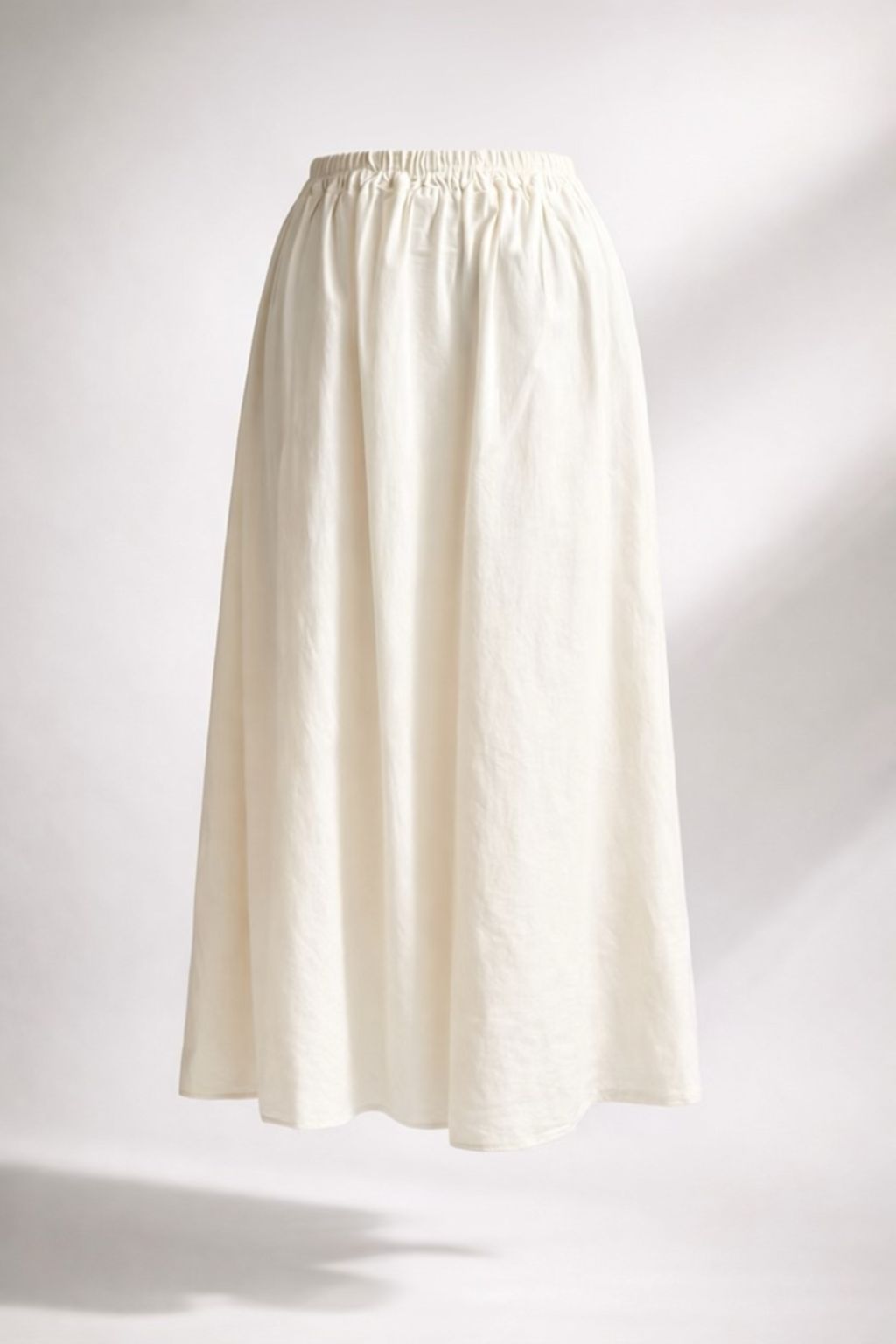 Falda midi en color crudo. Diseño evasé, lleva una doble capa en la parte delantera asimétrica, lo que hace diferente. Para mayor comodidad tiene goma en la parte de atrás.
