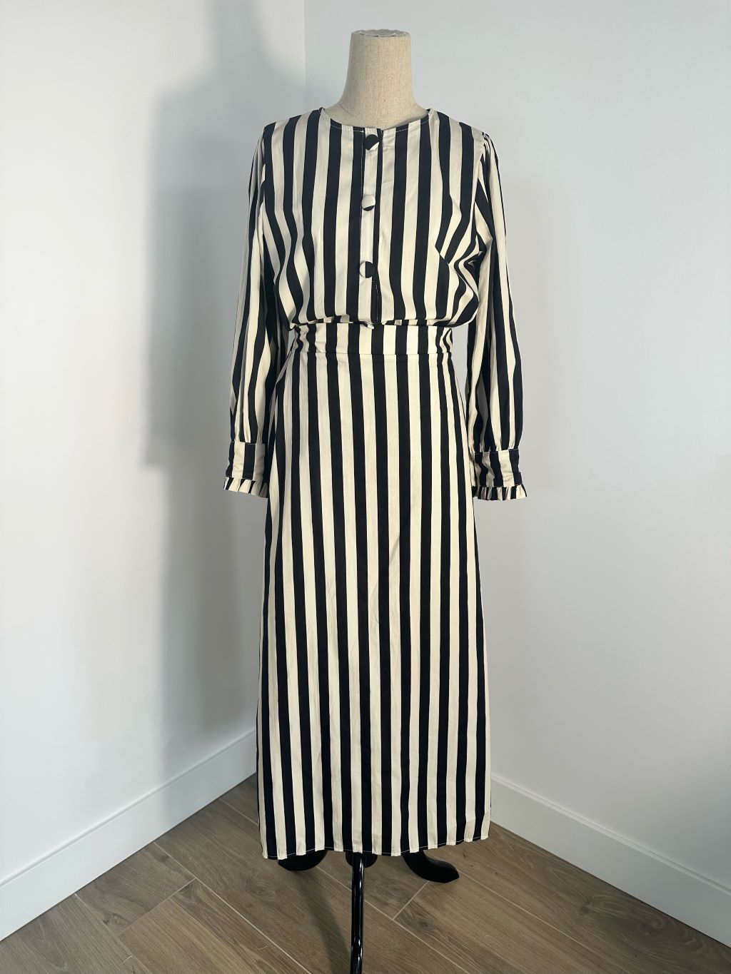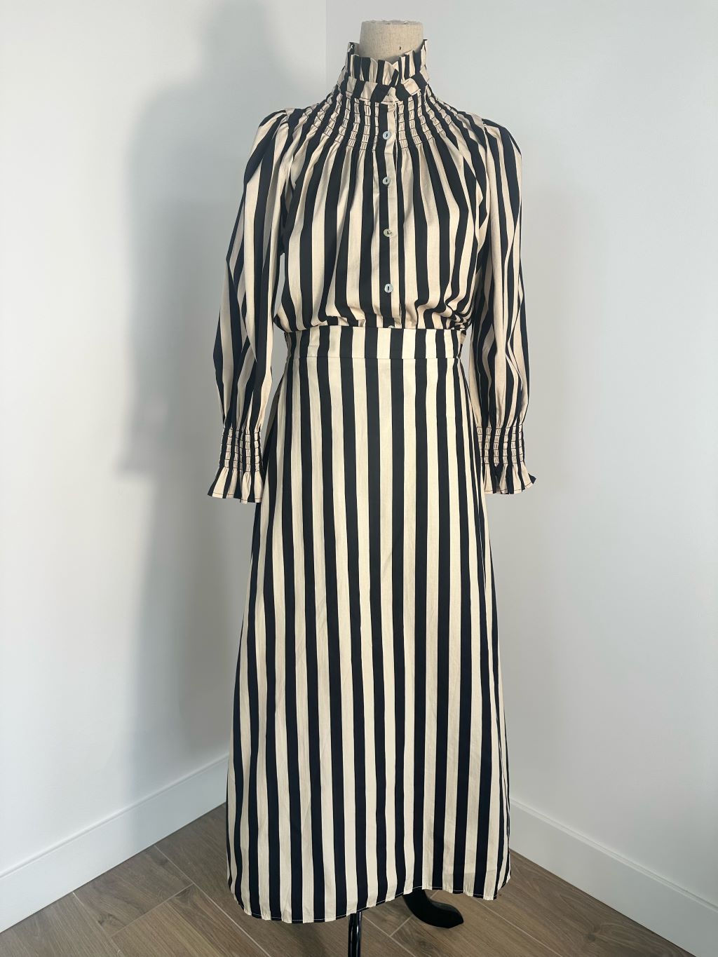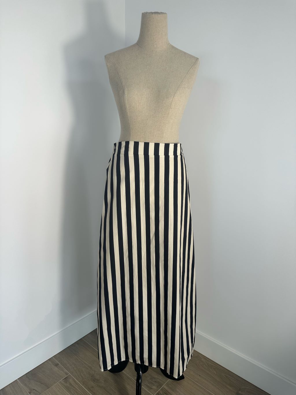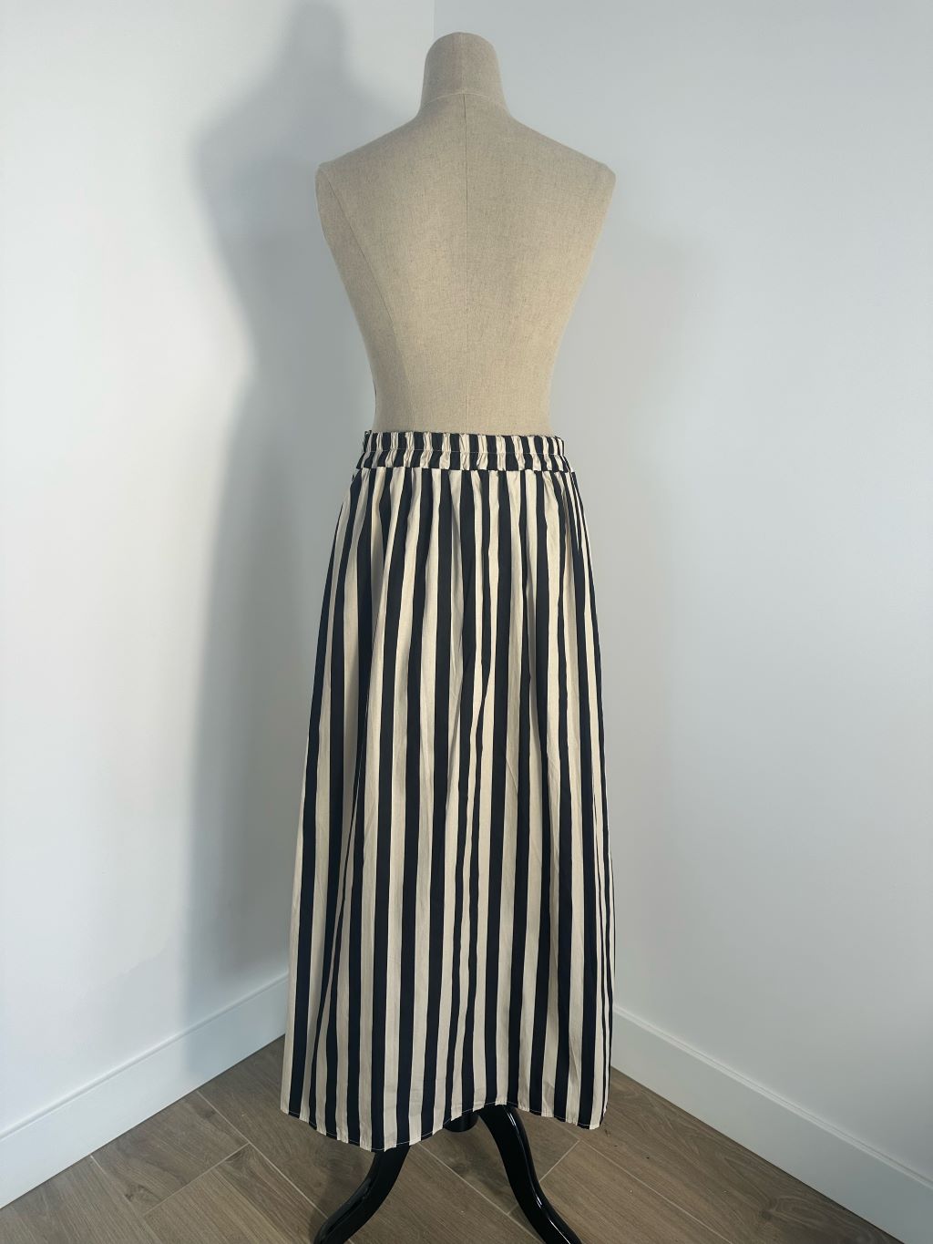 Falda larga con estampado en rayas crudo y negro. Corte evasé con cintura lisa y goma en la parte de atrás para adaptarse mejor. Ideal para cualquier look.