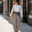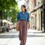Vaquero Balloon de rayas en color salmón y azul marino. Tiro alto y bolsillos. Cierre con botón metálico y cremallera. Goma en la parte de atrás. Destaca por su elástico proporcionando mayor comodidad. Perfecto para un look casual y aportando estilo con sus rayas verticales.