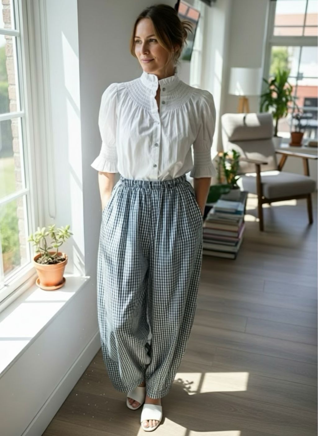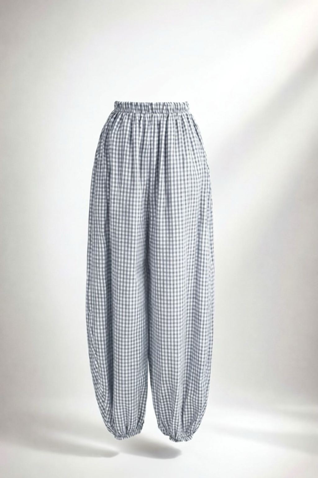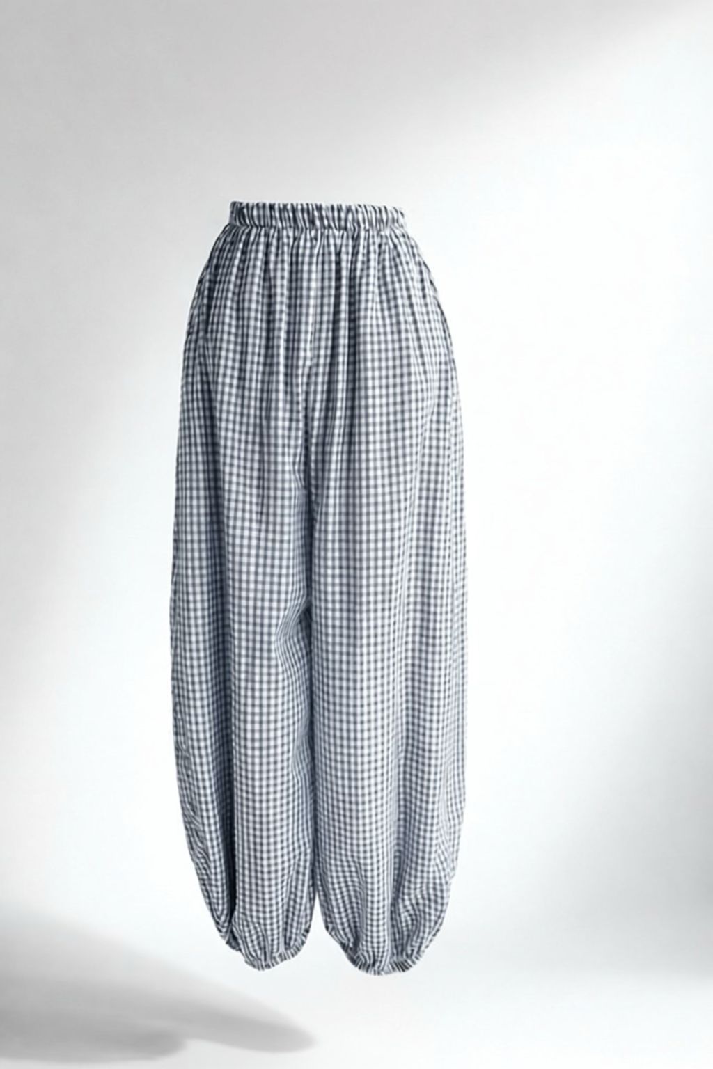 Pantalón bombacho en estampado vichy azul marino y blanco. lleva bolsillos en la parte de delante. Goma en toda la cintura para más comodidad. Goma en la parte de abajo. Destacar la caída del tejido y suavidad.