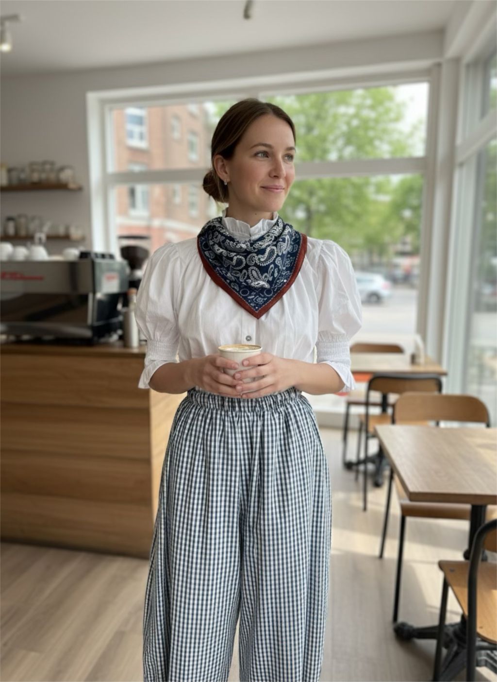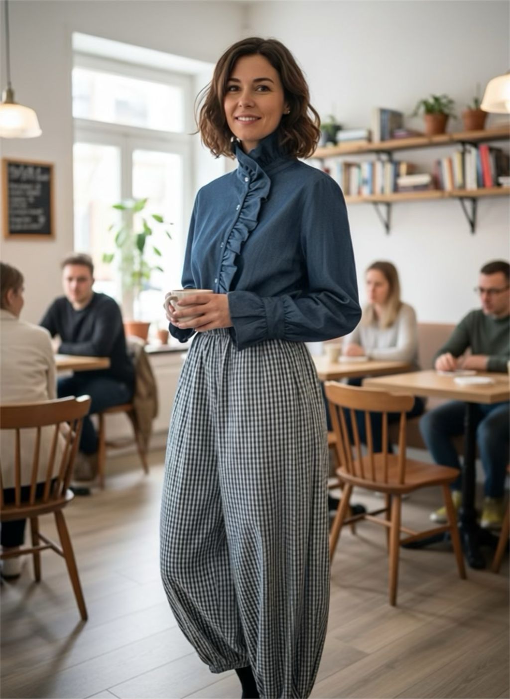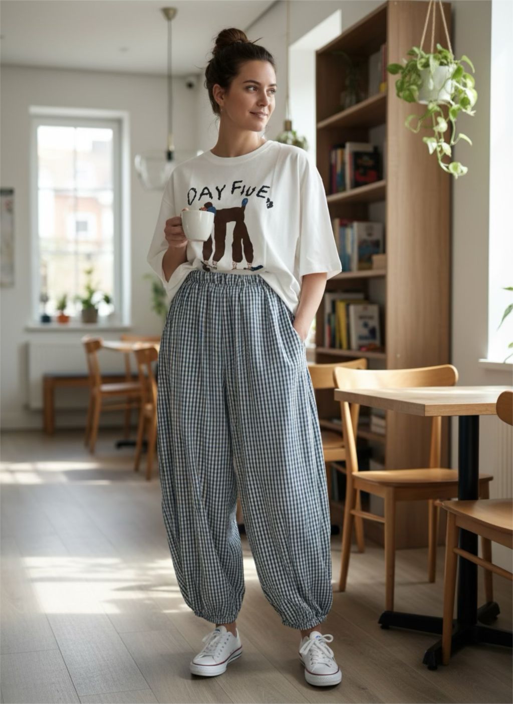 Pantalón bombacho en estampado vichy azul marino y blanco. lleva bolsillos en la parte de delante. Goma en toda la cintura para más comodidad. Goma en la parte de abajo. Destacar la caída del tejido y suavidad.
