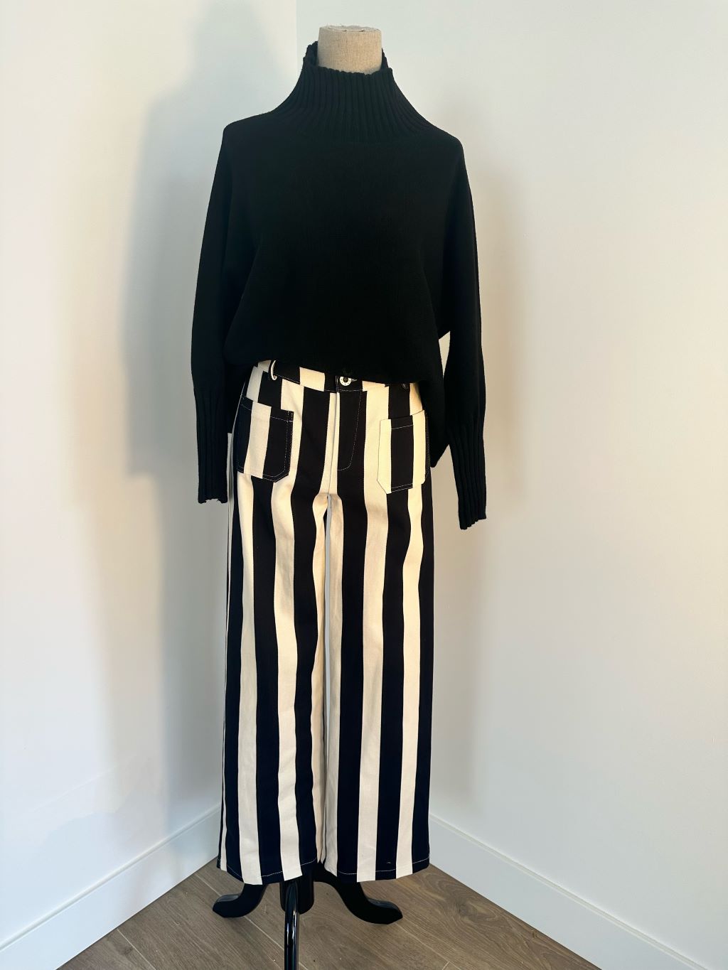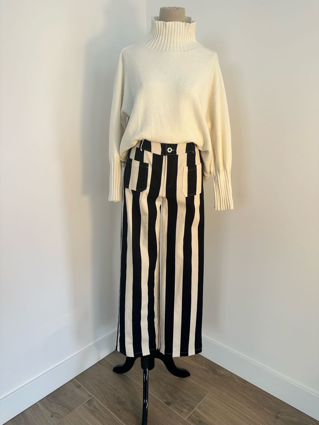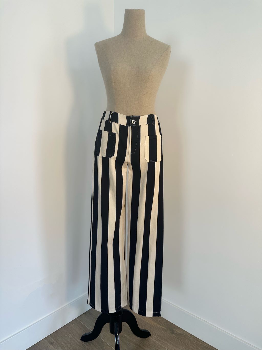 Pantalón estampado en rayas de color negro y crudo. Bolsillos tipo plastrón en delantero y en la parte de atrás. Corte recto, Cintura con botón y cremallera, goma en la parte de atrás. Tejido tipo vaquero, con un poco de elástico para mayor comodidad.