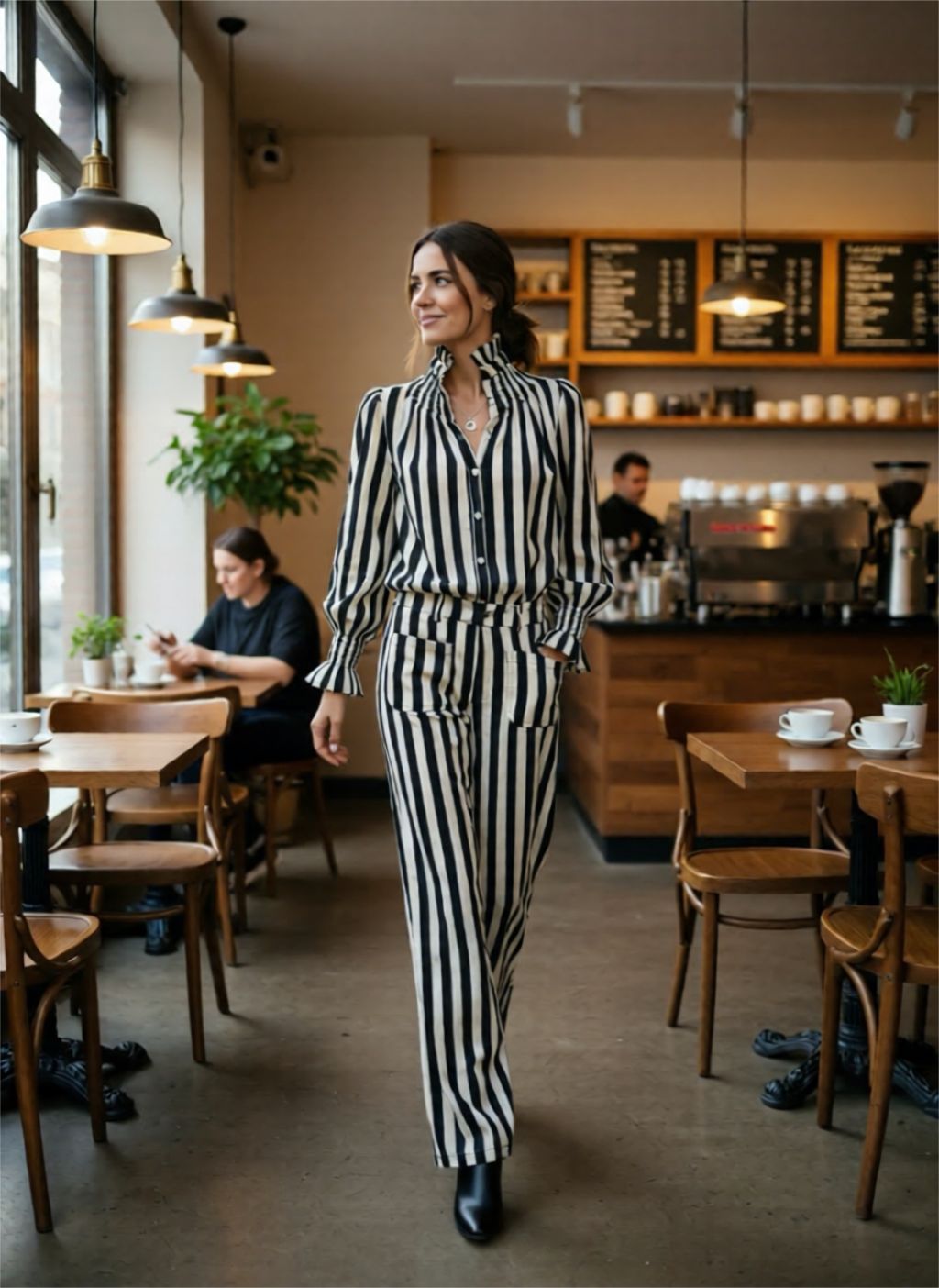 Pantalón de rayas en crudo y negro, de corte recto. Cierre frontal mediante botón y cremallera con bolsillos delanteros tipo plastrón. Tejido tipo vaquero con un pco de elástico para darle mayor comodidad.