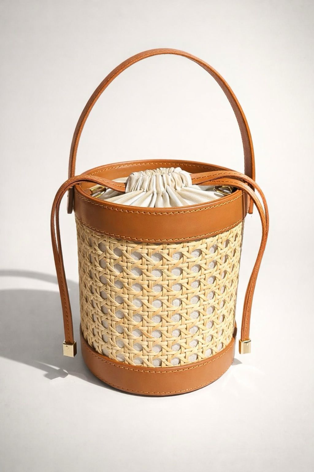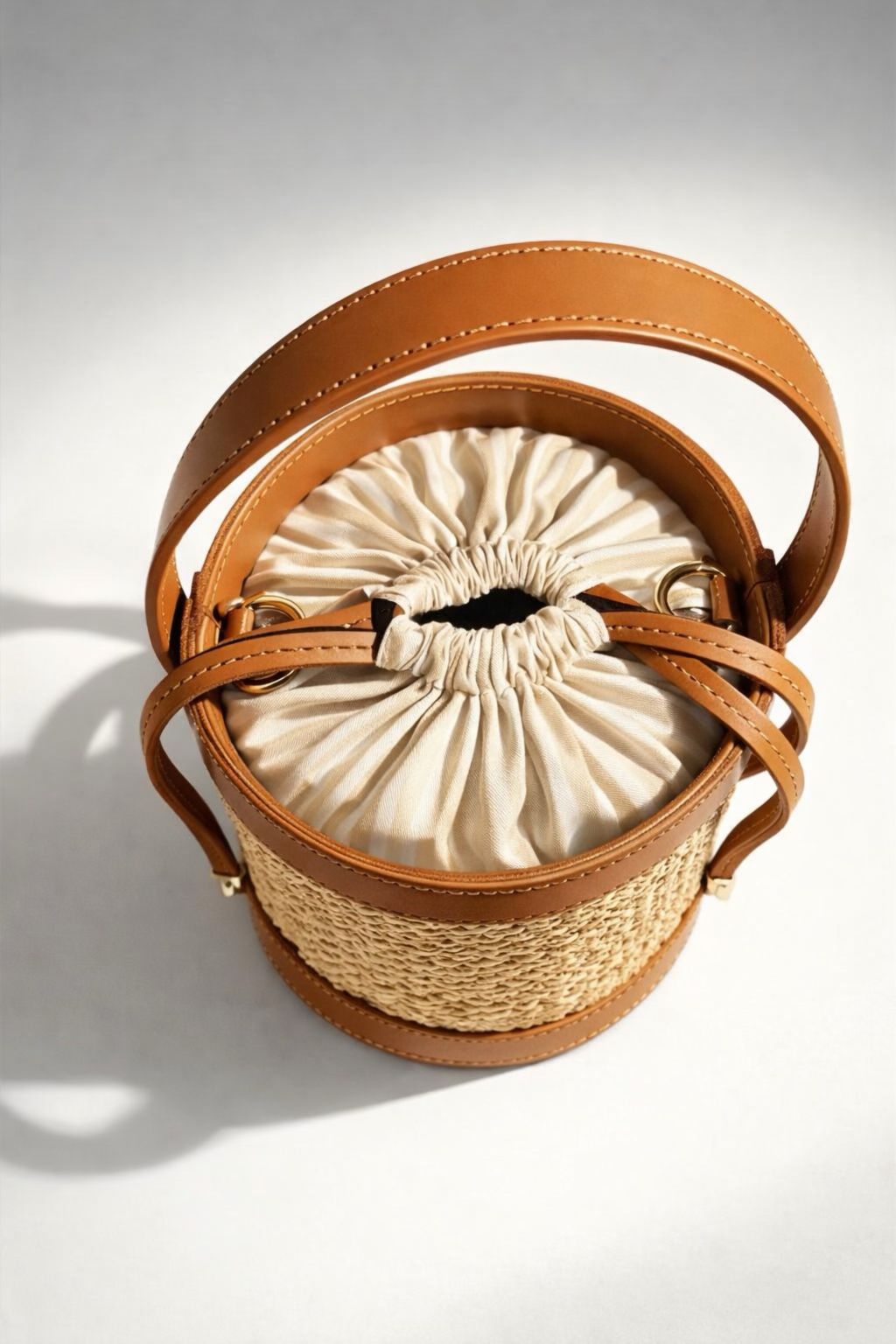 Bolso redondo realizado en rafia natural y piel 100%. de color avellana. Interior de algodón de rayas beige y blanco, con un bolsillo de cremallera. Cierre con cordón ajustable en la parte superior. Incorpora correa ajustable para usarla a modo de bandolera.