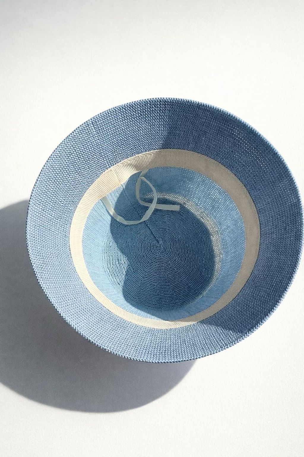 Sombrero en color azul claro, elaborado con pajas de papel, muy ligero. Es ajustable.