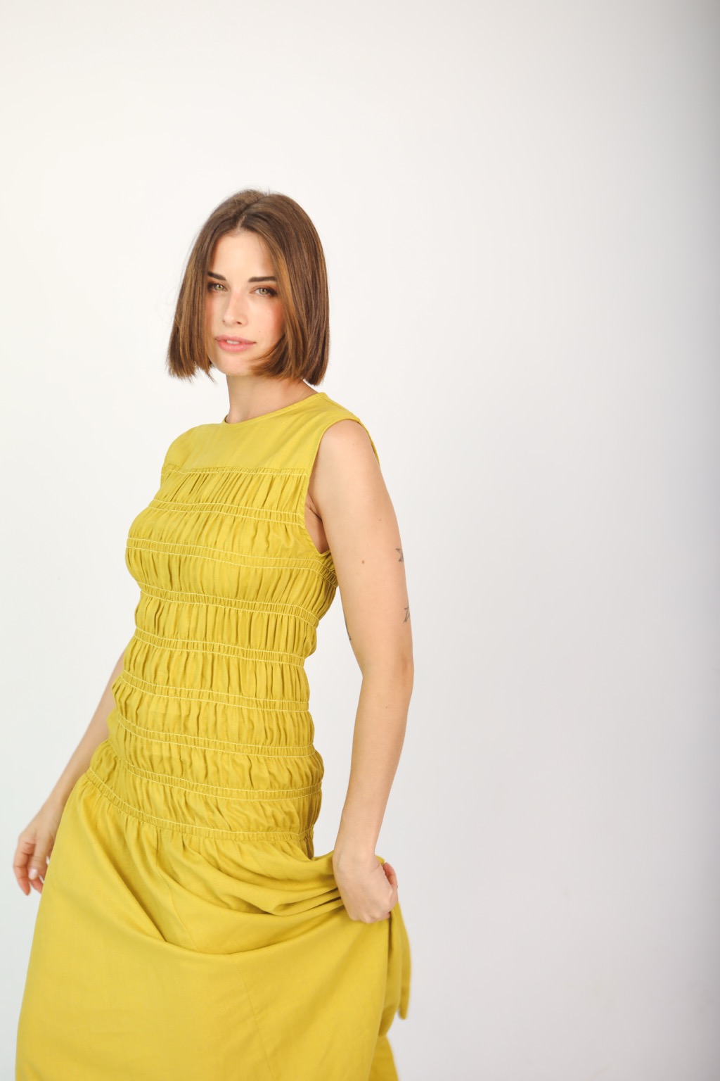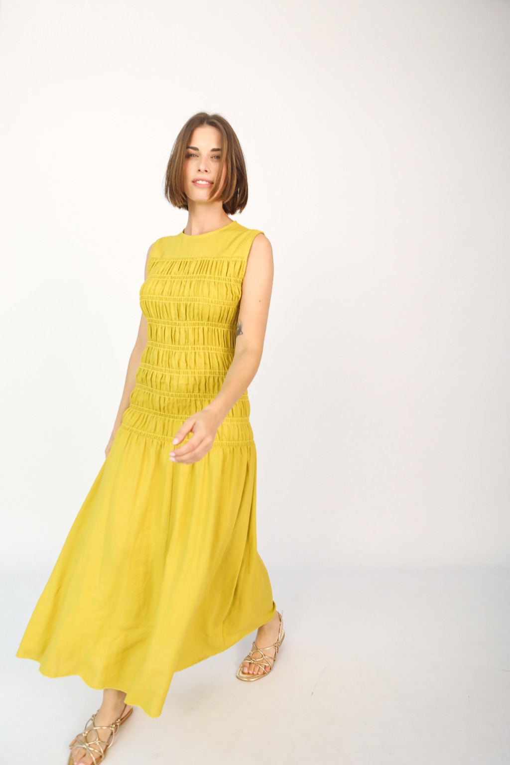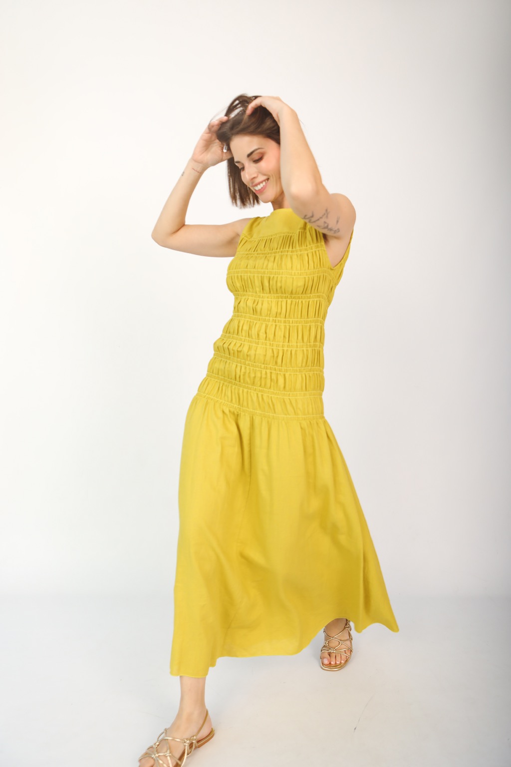 Vestido largo en color lima, con el cuerpo completo de nido de abeja elástico. Cierre en la parte de atrás con un botón. Corte recto y falda muy fluida. Sin mangas, tejido con movimiento y ligereza, ideal para un momento informal como para lucirlo en cualquier evento mas sofisticado.