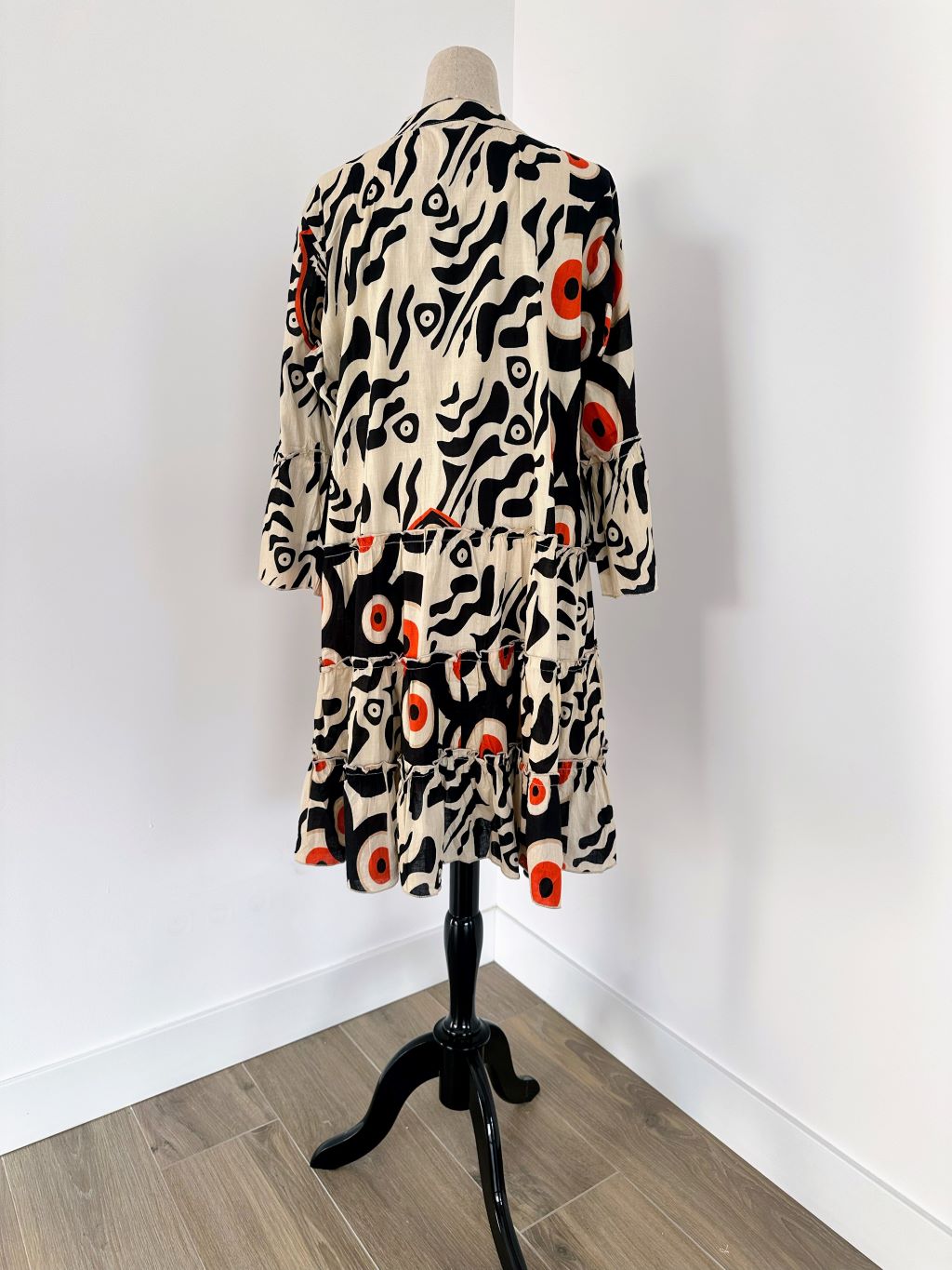 Vestido tipo kaftán con abotonadura completa, con volantes. Cuello mao terminado en V con botones y mangas 3/4 . Tejido 100% algodón de la India, ligero y fresco.
