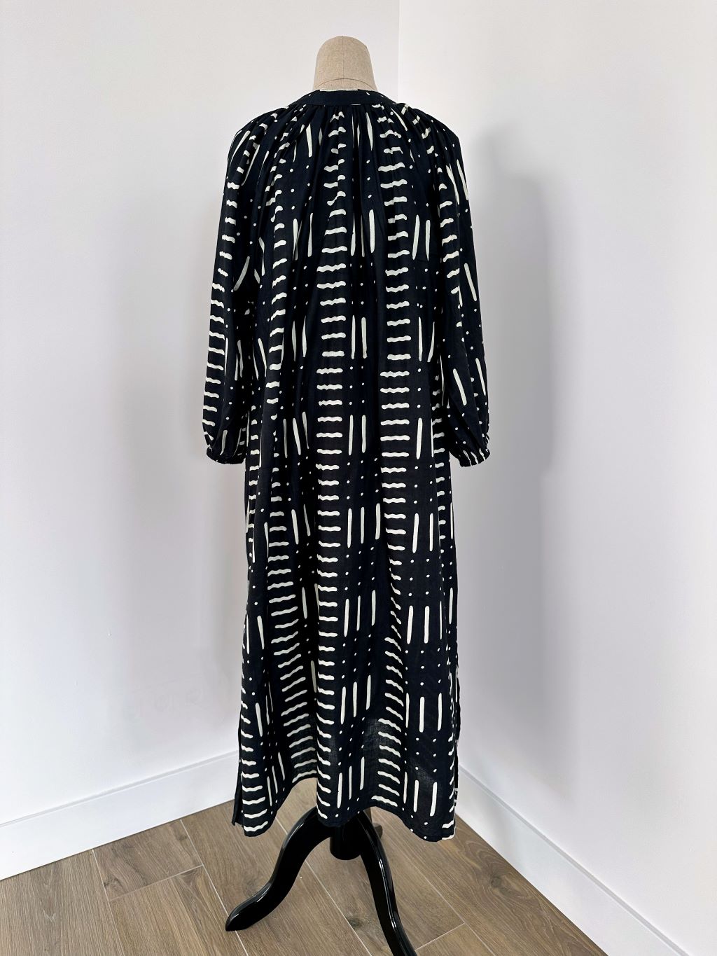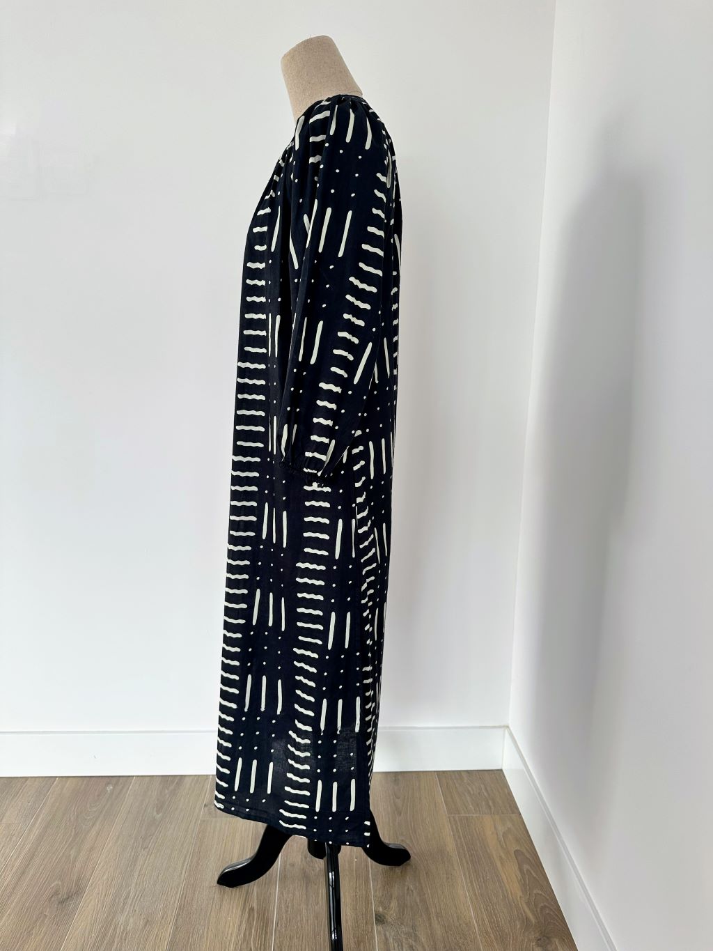 Vestido midi tipo kaftán de patrón amplio. Cuello mao terminado en V con botones y mangas 3/4 . Bolsillos laterales. Tejido 100% algodón de la India, ligero y fresco.
