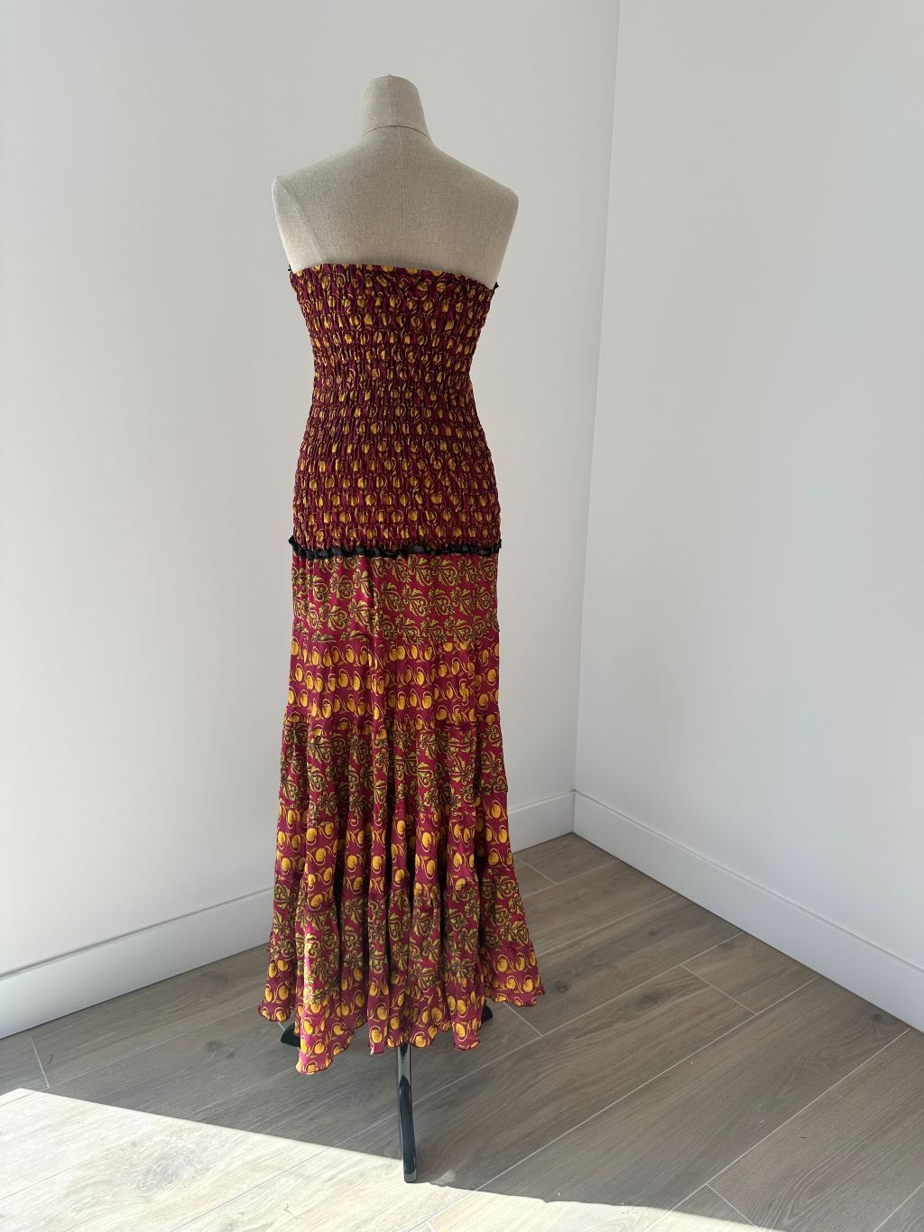 Vestido indio palabra de honor largo de estilo boho, confeccionado a mano en la India, con telas suaves y ligeras que se adaptan al cuerpo para mayor comodidad. Su estilo en palabra de honor realza los hombros, mientras que la espalda fruncida permite un ajuste flexible para distintas tallas y siluetas.